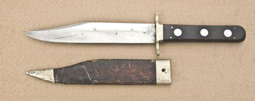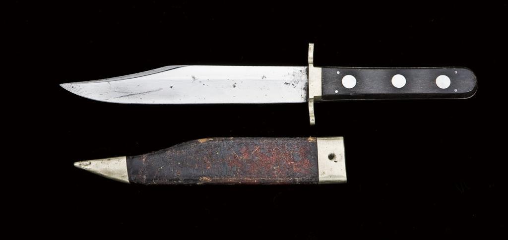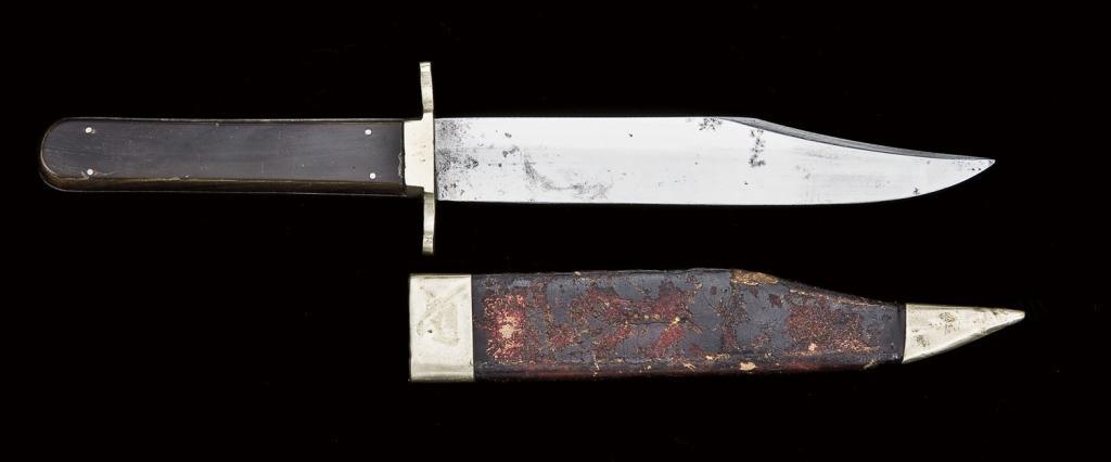 Small unmarked Sheffield Bowie knife. Approx 11-1/8” overall with 6-5/8” blade with a sharpened false edge and no ricasso. Blade is in near mint condition with almost all of the original polish and light, small patchesof discoloration. Full edge and tip. The hilt has horn scales with mother of pearl rondel decoration on the front side secured by four iron pins. The fancy crossguard with integral ferrule is cast German silver. Originalleather veneer over cardboard sheath with surface damage to the veneer on both sides and missing the throat button. Circa approx. 1860’s to 1870’s. Hugh Hayes Collection. Est.: $600 - $1,200