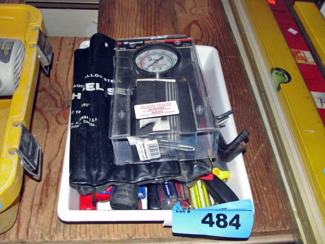 Small white plastic basket of assorted tools