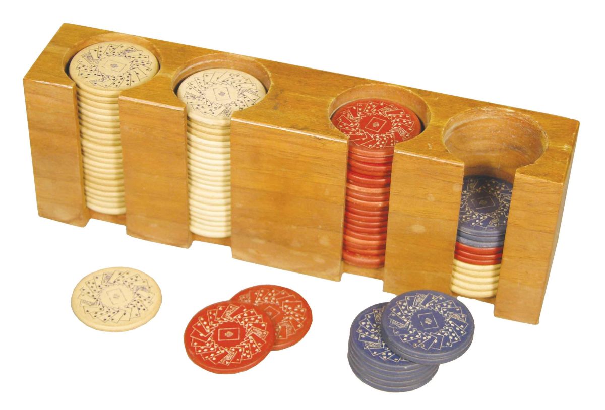 Small wood chip rack, with playing card motif chips. Almost full short by 4 chips otherwise very good condition. 9 X 3 X 1 3/4 inches.