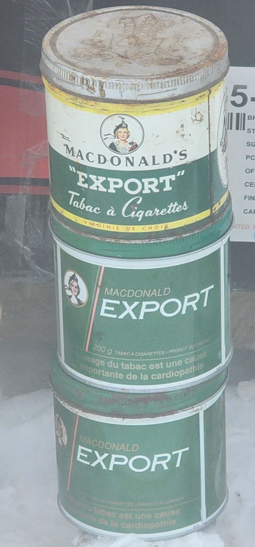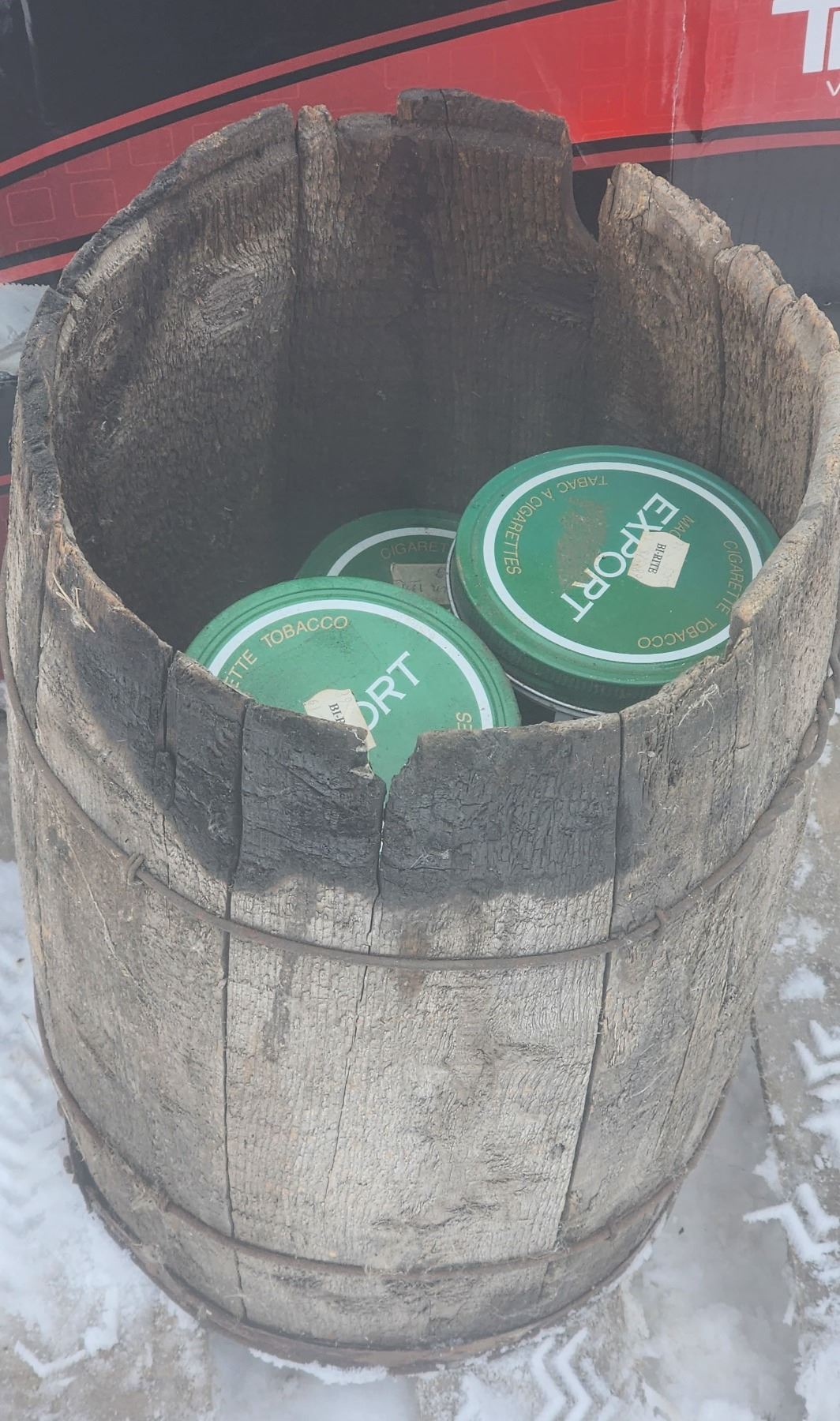 Small wooden keg, filled with assorted "Export" tobacco tins