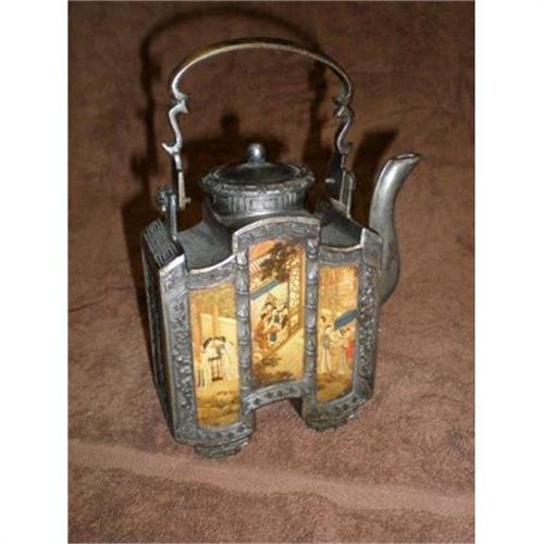 Smaller Chinese Pewter Decorative Tea Pot. It has six panels depicting a scene of women. Beautifully decorated and in great condition. It measures 8" tall by 5.75" wide by 2.25" deep. It is stamped on bottom in Chinese. It is a very lovely decorative item, would look great on any surface.