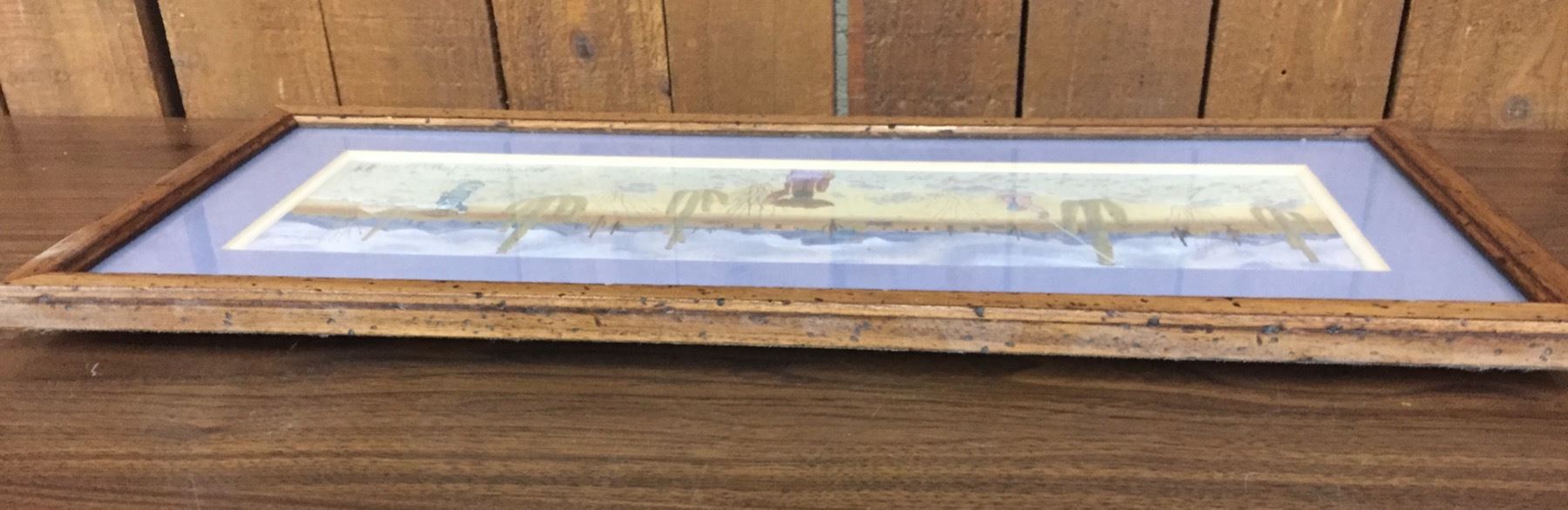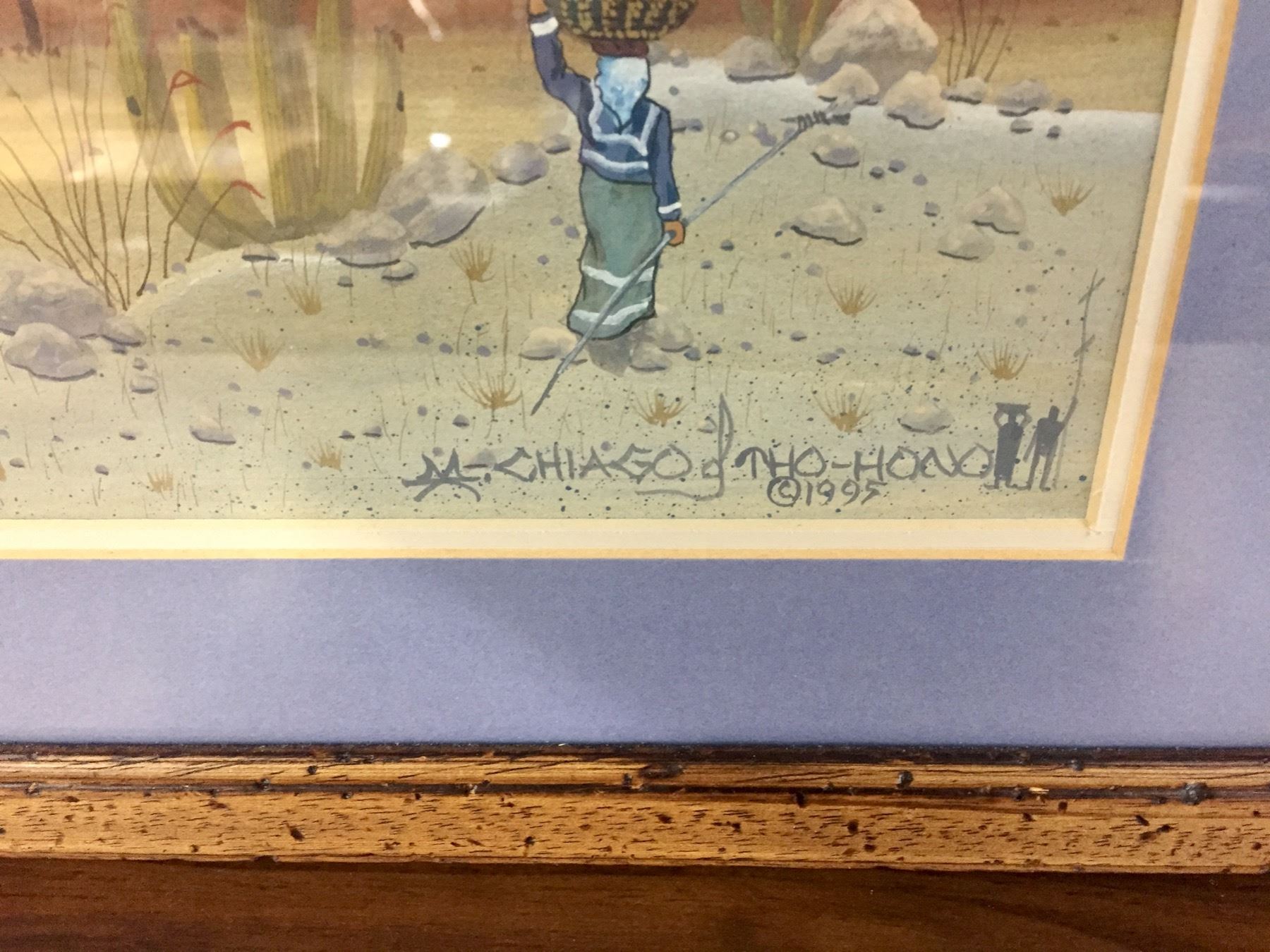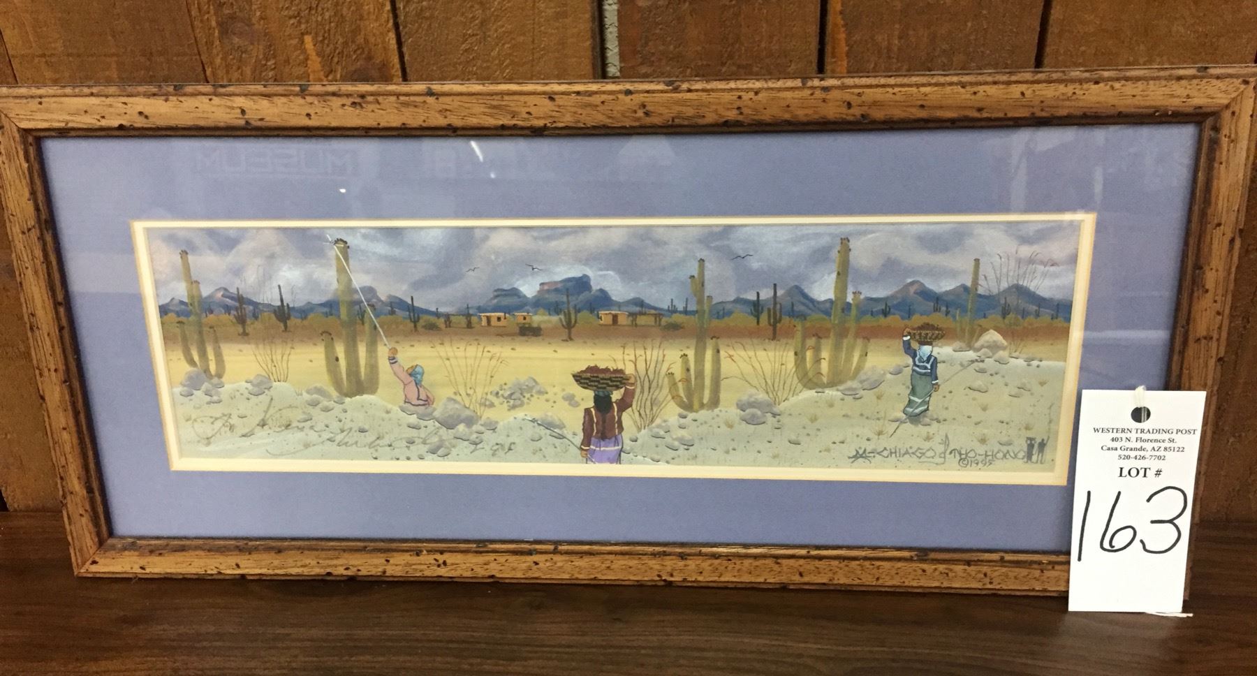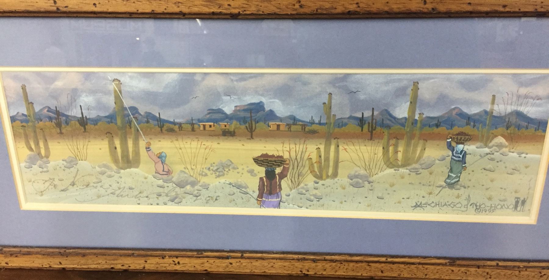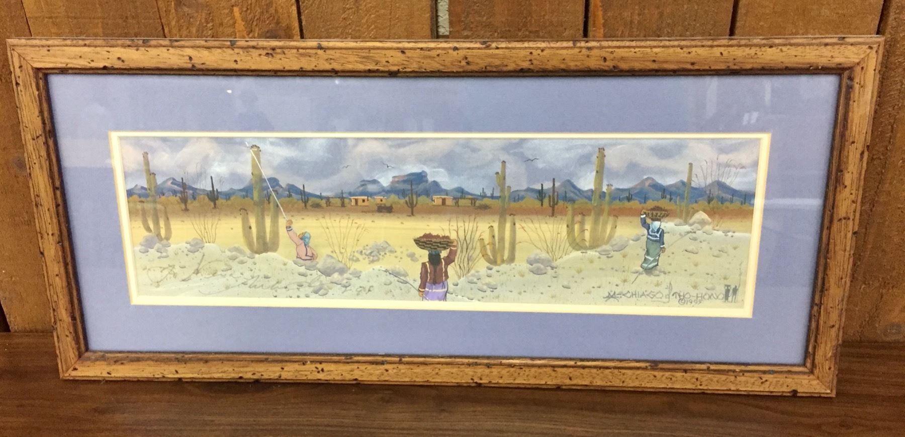 Description: Offered for sale in this lot is a beautiful desert scene watercolor by Micheal Chiago. It depicts people gathering the cactus fruit with a wonderful desert backdrop. Maker: Signed, Micheal Chiago, Tho-Hono. Approx. Age: 1995. Size: 21-1/2 inches wide x 9-1/2 inches tall with frame. Condition: Good for its age, normal wear expected. Please look closely at the pictures - they are an important part of our description. Shipping: There will be a $10 handling, packaging fee for shipping this lot. The actual cost of postage will be added on top of that.