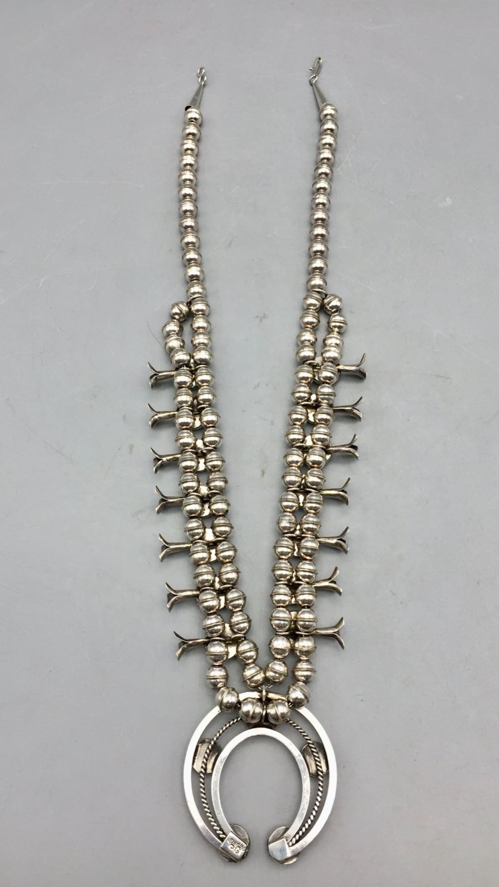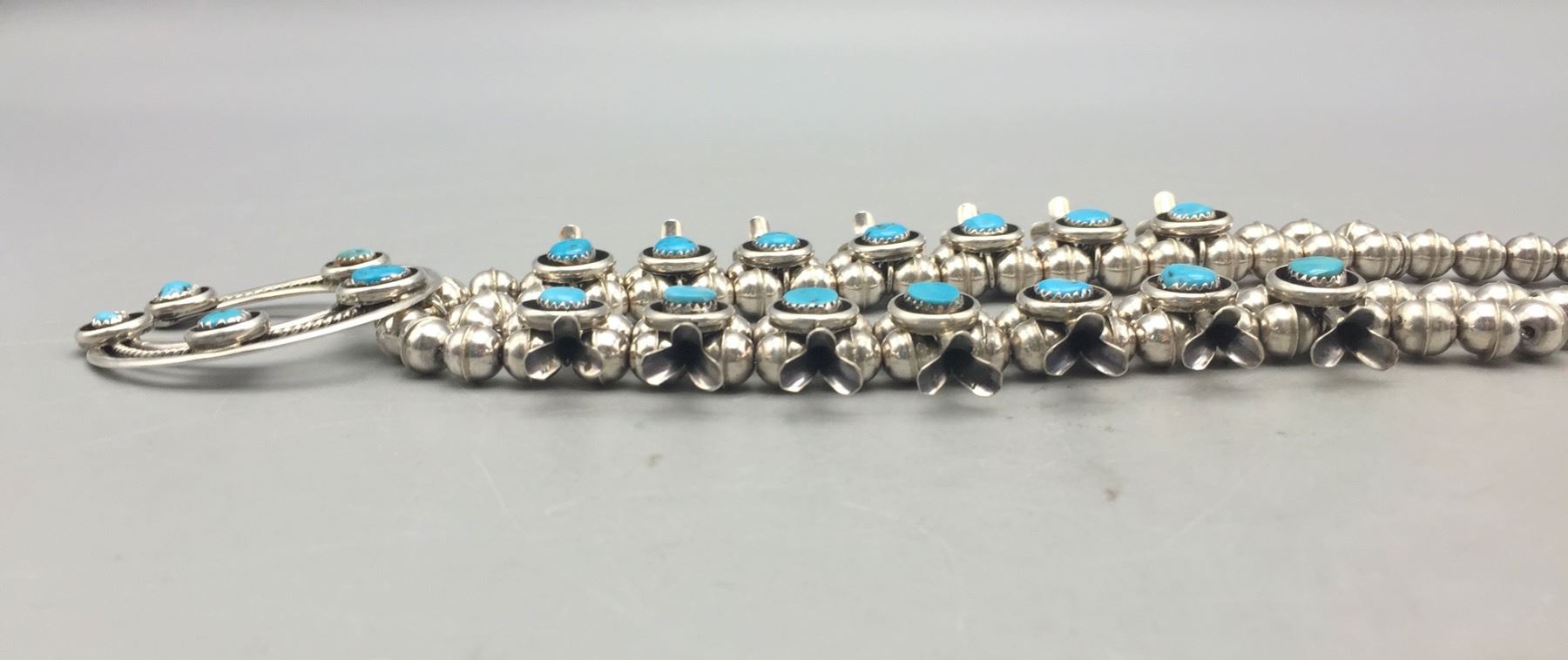 Description: Presented for sale in this lot is a smaller size squash blossom necklace perfect for children, small ladies or anyone looking for more of a dainty looking squash blossom. It is set with light blue turquoise stones. Marked as sterling silver. Maker: Hallmarked with either a DG or a PG. Approx. Age: Fairly modern. Size: Fits a 19 inch neck. Naja measures 1-7/8 inches long x 1-3/4 inches wide. Weighs 67.8 grams. Condition: Good for its age, normal wear expected. Please look closely at the pictures - they are an important part of our description. Shipping: There will be a $5 handling, packaging fee for shipping this lot. The actual cost of postage will be added on top of that.