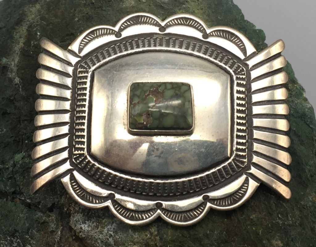 Maker: L. Stewart, (unknown, but looks Navajo in style). Approx. Age: Circa 1970s - 80s. Size: Measures 2 3/8” wide x 2” tall. Fits a belt up to 1.25” wide and weighs 29.9g. Condition: Good. NOS. Additional Info: Nice, stamped buckle with a turquoise setting. Marked as sterling and the artist’s name. Please look closely at the pictures - they are an important part of our description. Shipping: There will be a $5 handling / packaging fee for shipping this lot. The actual cost of postage will be added on top of that.