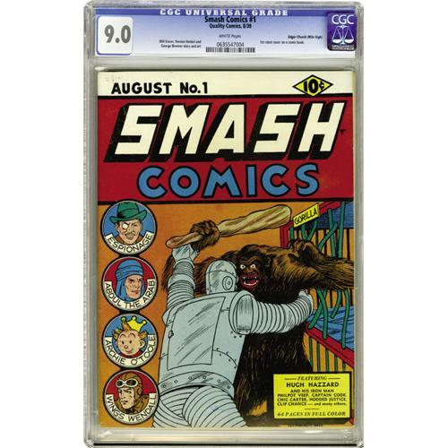 <B>Smash Comics #1 Mile High pedigree (Quality, 1939) CGC VF/NM 9.0 White pages.</B></I> This issue's got the first robot cover in all of comics according to Overstreet. The "Iron Man" on the cover is better known as Bozo the Robot, and his owner Hugh Hazzard is actually inside of him manning the controls (mind you, Bozo the Robot predated Bozo the Clown by several years). This is also one of the earlier gorilla covers in comics, plus it holds the distinction of being Quality's first "homegrown" series (<B>Feature Comics</B></I> was purchased from another publisher). Also of note are a story with Will Eisner art, featuring Black X, and the debuts of Hooded Justice (aka the Invisible Hood), Chic Carter of later <B>Police Comics</B></I> fame, and Wings Wendall. Overstreet 2006 VF/NM 9.0 value = $3,408; NM- 9.2 value = $4,800. CGC census 5/06: 3 in 9.0, none higher. <BR><BR><B>Important notice:</B> Heritage usually auctions material at the rate of 200-250 lots per hour. On some occasions eBay Live bid software or the Internet may not be able to keep up with the pace of the auction. We recommend placing a realistic absentee bid now as insurance to avoid disappointment. Occasionally the auctioneer may eliminate or reject an eBay Live bid, and the auctioneer may also reopen a lot after the close of the eBay live bidding (usually because we missed an audience bid), and may reject your bid even if it shows you as the winning bidder. By bidding via eBay Live, you agree that Heritage may award the lot to another bidder at its sole discretion under the circumstances described above or any other reasonable circumstances. Since eBay bids are not shown to us until we open the lot on the floor, we treat those bids just like floor bids. In most cases the floor responds before the eBay bid is presented to us, due to Internet lag time, so for consistency we have made it a policy that floor bids are always considered first over tie eBay live bids. Also please note that all Heritage lots purchased through eBay Live carry a 22.5% Buyer's Premium. Please make sure you read the Terms and Conditions before you bid. This lot is being auctioned in conjunction with a live floor auction by Heritage Auction Galleries. All final auction and invoice information will be supplied by Heritage Auction Galleries, and all other information should be considered preliminary. Lot:41001 <BR><BR><B>Winning Notification and Billing:</B> After the FINAL session in this auction is complete, Heritage will send e-mail and snail mail invoices. This process normally takes several days. All final auction and invoice information will be supplied by Heritage Auction Galleries, and all other information should be considered preliminary. <BR><BR>This auction will be conducted on a live auction floor and over the Internet through eBay Live. If you choose to place an absentee bid, please take a moment to <font color='#0000ff'><u><a href='http://pages.ebay.com/liveauctions/help/before/laabsentee.html'>learn how eBay Live absentee bidding works</a></u></font><font color='#000000'>