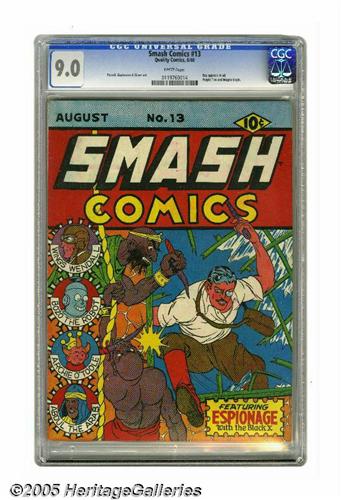 <B>Smash Comics #13 (Quality, 1940) CGC VF/NM 9.0 White pages.</B></I> The Purple Trio and Magno begin in this issue, and a back cover ad touts the first appearance of the Ray in the following month's issue. This is the highest-graded copy of only three of issue #13 to be certified by CGC to date. Overstreet 2005 VF/NM 9.0 value = $557; NM- 9.2 value = $750. CGC census 7/05: 1 in 9.0, none higher.