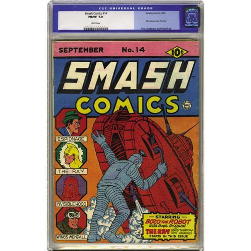 <B>Smash Comics #14 (Quality, 1940) CGC FN/VF 7.0 White pages.</B></I> The first appearance of the Ray is featured in this issue, which boasts art from Lou Fine, Bob Powell, and Paul Gustavson. This is the second highest-graded copy of #14 that CGC has certified to date. Overstreet 2006 FN 6.0 value = $912; VF 8.0 value = $1,900. CGC census 5/06: 1 in 7.0, 1 higher. <BR><BR><B>Important notice:</B> Heritage usually auctions material at the rate of 200-250 lots per hour. On some occasions eBay Live bid software or the Internet may not be able to keep up with the pace of the auction. We recommend placing a realistic absentee bid now as insurance to avoid disappointment. Occasionally the auctioneer may eliminate or reject an eBay Live bid, and the auctioneer may also reopen a lot after the close of the eBay live bidding (usually because we missed an audience bid), and may reject your bid even if it shows you as the winning bidder. By bidding via eBay Live, you agree that Heritage may award the lot to another bidder at its sole discretion under the circumstances described above or any other reasonable circumstances. Since eBay bids are not shown to us until we open the lot on the floor, we treat those bids just like floor bids. In most cases the floor responds before the eBay bid is presented to us, due to Internet lag time, so for consistency we have made it a policy that floor bids are always considered first over tie eBay live bids. Also please note that all Heritage lots purchased through eBay Live carry a 22.5% Buyer's Premium. Please make sure you read the Terms and Conditions before you bid. This lot is being auctioned in conjunction with a live floor auction by Heritage Auction Galleries. All final auction and invoice information will be supplied by Heritage Auction Galleries, and all other information should be considered preliminary. Lot:41001 <BR><BR><B>Winning Notification and Billing:</B> After the FINAL session in this auction is complete, Heritage will send e-mail and snail mail invoices. This process normally takes several days. All final auction and invoice information will be supplied by Heritage Auction Galleries, and all other information should be considered preliminary. <BR><BR>This auction will be conducted on a live auction floor and over the Internet through eBay Live. If you choose to place an absentee bid, please take a moment to <font color='#0000ff'><u><a href='http://pages.ebay.com/liveauctions/help/before/laabsentee.html'>learn how eBay Live absentee bidding works</a></u></font><font color='#000000'>