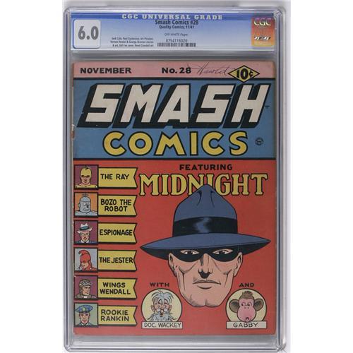 <B>Smash Comics #28 (Quality, 1941) CGC FN 6.0 Off-white pages.</B></I> Only the esteemed Rockford copy has been graded higher than this one by CGC as of this writing. This issue marked the beginning of Midnight's tenure as cover star, a title he never relinquished for the remainder of the book's eight-year run! Quality Editor Gill Fox is credited with the cover, and Jack Cole and Reed Crandall contributed interior art. Overstreet 2006 FN 6.0 value = $198. CGC census 2/06: 1 in 6.0, 1 higher. <I>From the Collection of Harold Curtis.</B></I>