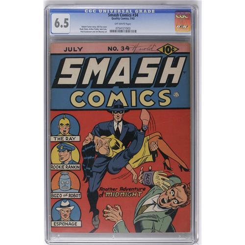 <B>Smash Comics #34 (Quality, 1942) CGC FN+ 6.5 Off-white pages.</B></I> Only the Mile High copy has been graded higher than this one to date! The star of the issue is Midnight, drawn by Jack Cole inside the comic and by Gill Fox on the cover. Overstreet 2006 FN 6.0 value = $168; VF 8.0 value = $350. CGC census 3/06: 1 in 6.5, 1 higher. <I>From the Collection of Harold Curtis.</B></I>