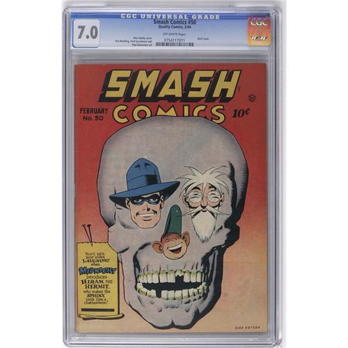 <B>Smash Comics #50 (Quality, 1944) CGC FN/VF 7.0 Off-white pages.</B></I> Skull cover by Alex Kotzky. Klaus Nordling, Fred Guardineer, and Paul Gustavson art. Overstreet 2006 FN 6.0 value = $120; VF 8.0 value = $239. CGC census 4/06: 1 in 7.0, 1 higher. <I>From the Collection of Harold Curtis.</B></I>