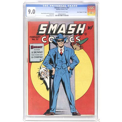 <B>Smash Comics #57 Davis Crippen ("D" Copy) pedigree (Quality, 1945) CGC VF/NM 9.0 Off-white to white pages.</B></I> Featuring Midnight. Overstreet 2006 VF/NM 9.0 value = $264; NM- 9.2 value = $350. CGC census 6/06: 1 in 9.0, 1 higher. <I>From the Crippen Collection.</B></I> <BR><BR><B>Important notice:</B> Heritage usually auctions material at the rate of 200-250 lots per hour. On some occasions eBay Live bid software or the Internet may not be able to keep up with the pace of the auction. We recommend placing a realistic absentee bid now as insurance to avoid disappointment. Occasionally the auctioneer may eliminate or reject an eBay Live bid, and the auctioneer may also reopen a lot after the close of the eBay live bidding (usually because we missed an audience bid), and may reject your bid even if it shows you as the winning bidder. By bidding via eBay Live, you agree that Heritage may award the lot to another bidder at its sole discretion under the circumstances described above or any other reasonable circumstances. Since eBay bids are not shown to us until we open the lot on the floor, we treat those bids just like floor bids. In most cases the floor responds before the eBay bid is presented to us, due to Internet lag time, so for consistency we have made it a policy that floor bids are always considered first over tie eBay live bids. Also please note that all Heritage lots purchased through eBay Live carry a 22.5% Buyer's Premium. Please make sure you read the Terms and Conditions before you bid. This lot is being auctioned in conjunction with a live floor auction by Heritage Auction Galleries. All final auction and invoice information will be supplied by Heritage Auction Galleries, and all other information should be considered preliminary. Lot:41001 <BR><BR><B>Winning Notification and Billing:</B> After the FINAL session in this auction is complete, Heritage will send e-mail and snail mail invoices. This process normally takes several days. All final auction and invoice information will be supplied by Heritage Auction Galleries, and all other information should be considered preliminary. <BR><BR>This auction will be conducted on a live auction floor and over the Internet through eBay Live. If you choose to place an absentee bid, please take a moment to <font color='#0000ff'><u><a href='http://pages.ebay.com/liveauctions/help/before/laabsentee.html'>learn how eBay Live absentee bidding works</a></u></font><font color='#000000'>