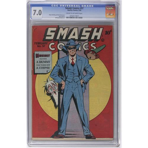 <B>Smash Comics #57 (Quality, 1945) CGC FN/VF 7.0 Cream to off-white pages.</B></I> Featuring Midnight. Klaus Nordling and Paul Gustavson art. Overstreet 2006 FN 6.0 value = $93; VF 8.0 value = $178. CGC census 1/06: 1 in 7.0, 1 higher. <I>From the Collection of Harold Curtis.</B></I>