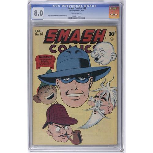<B>Smash Comics #58 (Quality, 1945) CGC VF 8.0 Off-white pages.</B></I> Starring Midnight and Lady Luck. Overstreet 2006 VF 8.0 value = $178. CGC census 1/06: 1 in 8.0, 1 higher. <I>From the Collection of Harold Curtis.</B></I>