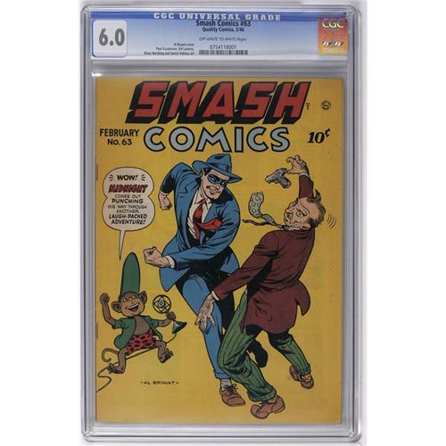<B>Smash Comics #63 (Quality, 1946) CGC FN 6.0 Off-white to white pages.</B></I> Al Bryant cover featuring Midnight. Klaus Nordling and Paul Gustavson art. Overstreet 2006 FN 6.0 value = $75. CGC census 3/06: 1 in 6.0, 2 higher. <I>From the Collection of Harold Curtis.</B></I>