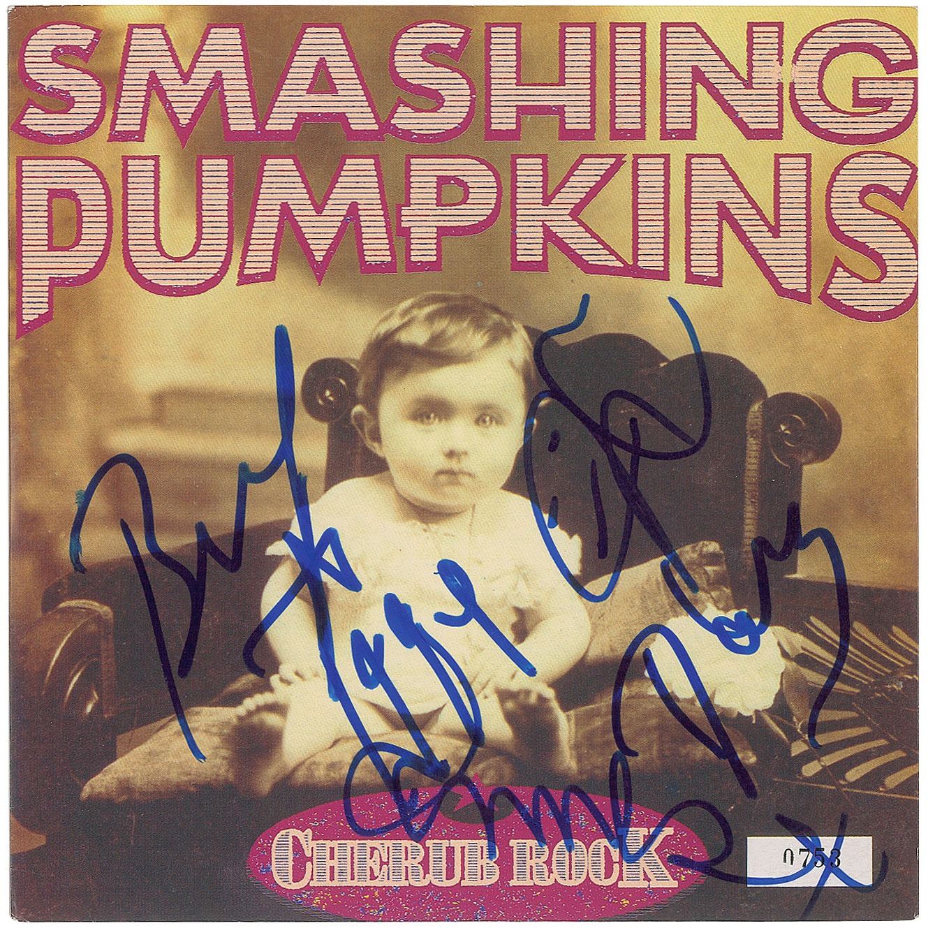 Hut Recordings 45 RPM single record for 'Cherub Rock / Purr Snickety,' signed on the sleeve in blue felt tip, "Billy, 1994," "JC," "James, x," and "D'arcy." In fine condition. The record is included.