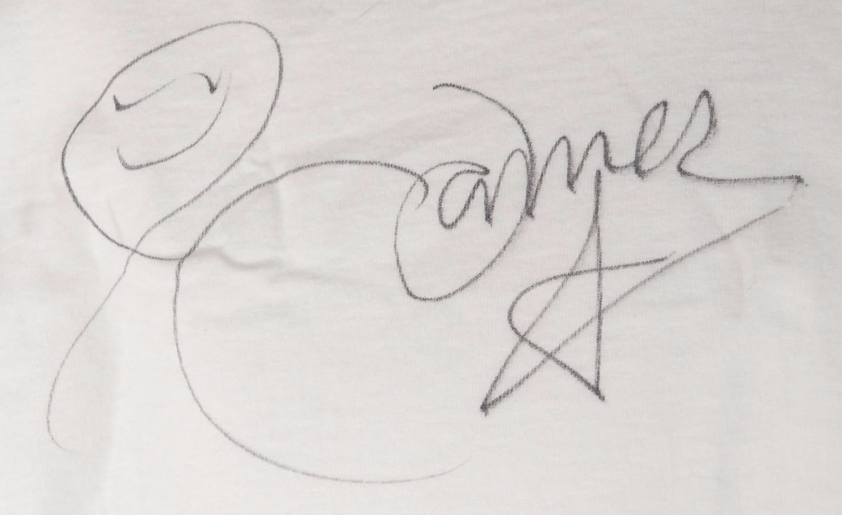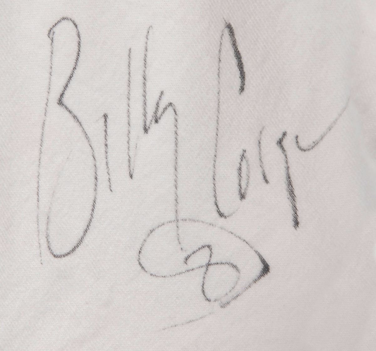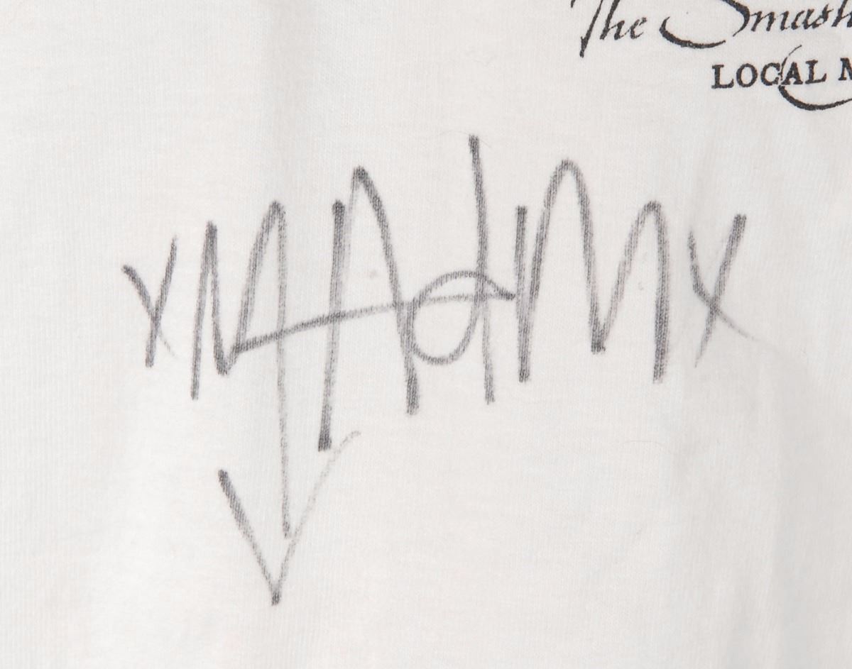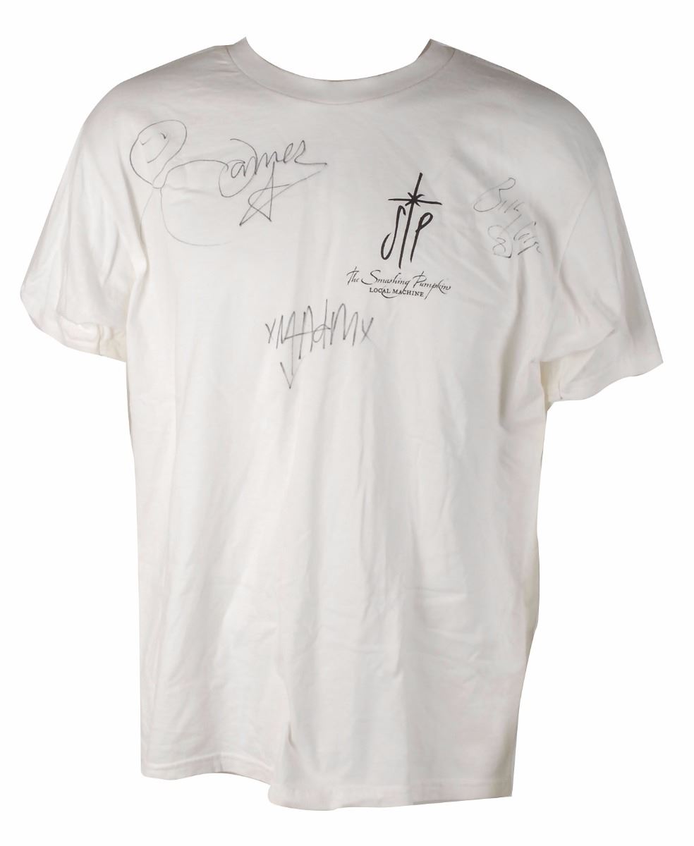 Uncommon white crew Smashing Pumpkins T-shirt from the band’s Local Machine UK tour in 2000, size XL, signed on the chest in black felt tip by Billy Corgan, James Iha, Jimmy Chamberlin, and Melissa Auf der Maur. In fine condition.