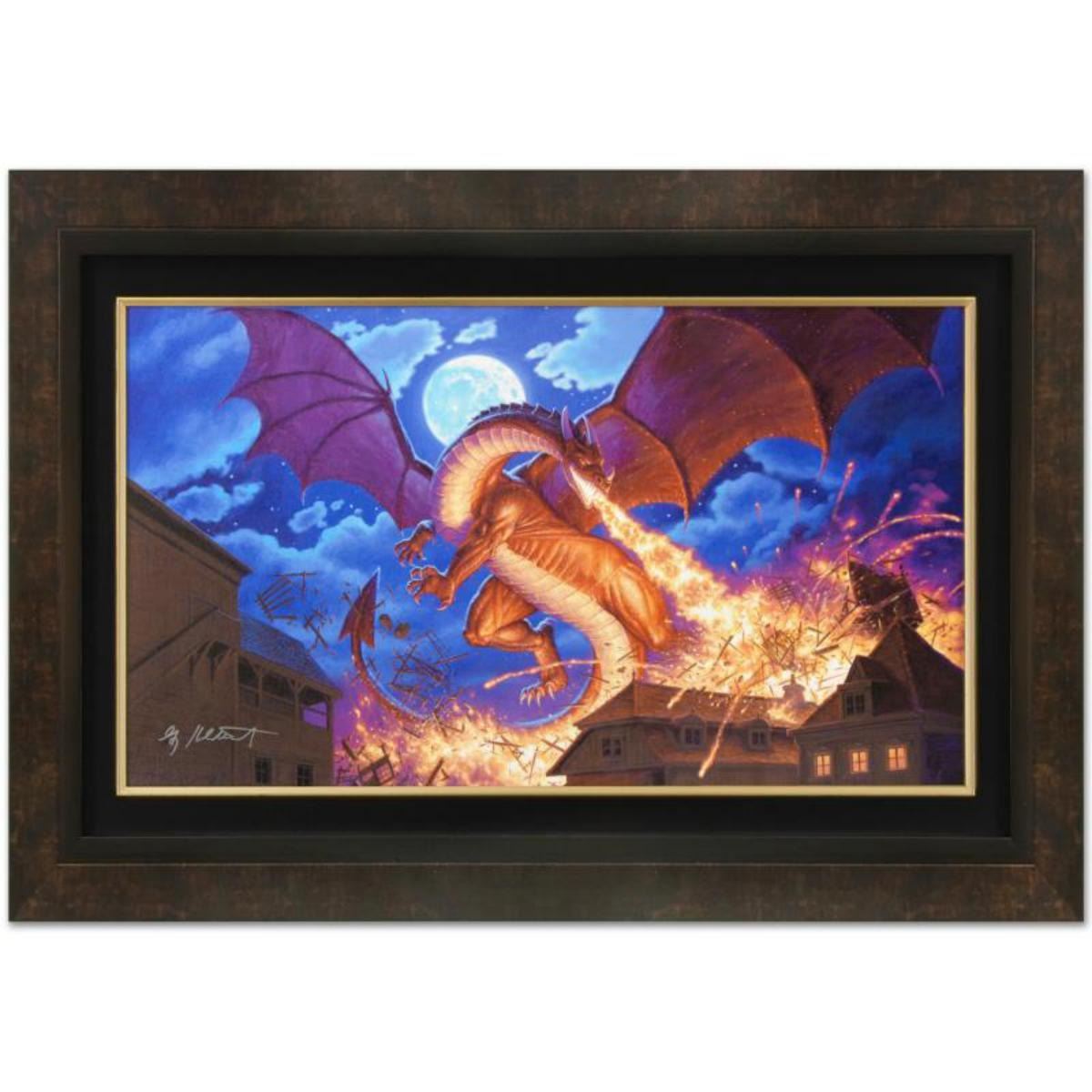 Known world wide for his fantasy and science fiction illustrations, Greg Hildebrandt has created an abundance of fascinating artwork including, and most notably his illustration work for J.R.R. Tolkien's 'The Hobbit' and 'Lord of the Rings'. "Smaug Destroys Laketown", originally created in the 1970's for Ballantine Books, is a limited edition giclee on canvas, numbered and hand signed by Greg Hildebrandt! This piece comes custom framed using acid free and archival materials and is ready to hang. Includes Certificate of Authenticity! Measures approx. 40.5" x 28" (with frame), 31" x 18.5" (image). Reference #: 189919