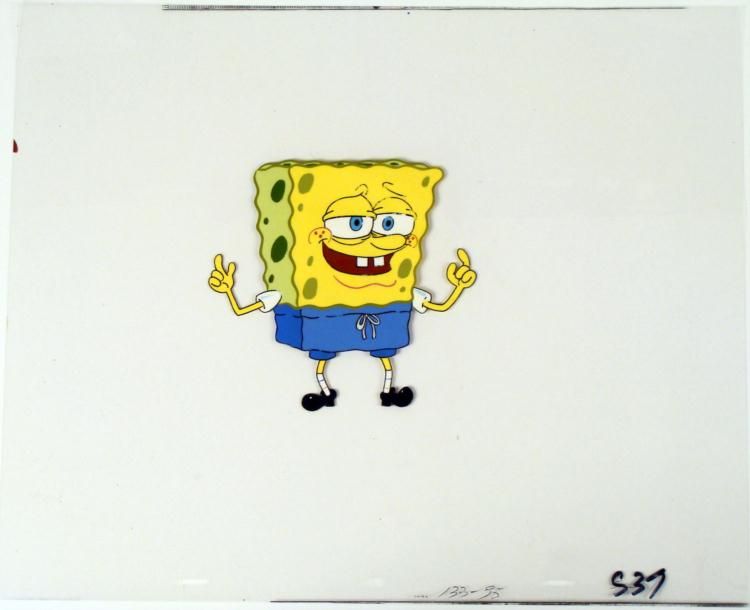 This original animation cel is from the Nickelodeon TV show SpongeBob Squarepants. The story takes place under the deep blue sea in Bikini Bottom, where SpongeBob resides. SpongeBob, who is a yellow, porous sponge, is your typical happy-go-lucky character, * as he is always cheerful and enjoys making people laugh. Patrick Star, SpongeBob's neighbor who is a starfish, is your average children's show idiot, as he boasts knowing nothing and is often getting himself into ridiculous situations. Between the homes of * these two lies the home of the miserable Squidward, a squid, who is known for being grouchy and playing tricks on SpongeBob and Patrick. Both SpongeBob and Squidward work at the Krusty Krab, a fast food business run by the greedy money-loving Mr. Krabs, a * crab, the arch rival of the evil, possibly misunderstood, Plankton. Another neighbor, Sandy Cheeks, an athletic squirrel who normally wears an astronaut's space suit, was introduced in "Tea at the Treedome." She spends most of her time inventing and experimenting. * * Snap....snap * * * * * * Original Production Animated Cel * Overall Size of Cel: 13 1/2" x 16 1/2" * Very Good Condition * This is an original hand-painted cel set-up used in the production of an episode of "SpongeBob SquarePants." Each one-of-a-kind set-up represents a slight change in position of the characters. When individually photographed and projected in rapid succession, * the images appear to move. * * To create production cels, the original animator's drawing is transferred onto an acetate cel (by hand-inking and/or photo copying). The cel is then hand-painted on the reverse side. * * The cel is ready to be matted and framed. The animator's notations are at the bottom of the cel. * * * *
