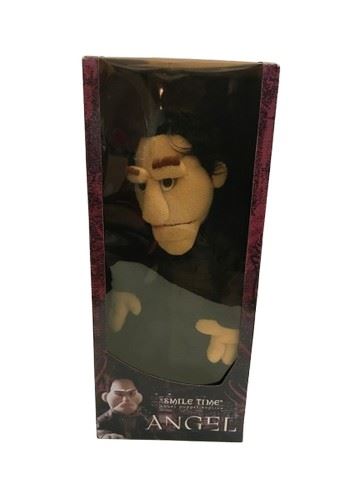 "Smile Time" Angel puppet replica. This replica was inspired by the popular Buffy the Vampire Slayer spin-off series, Angel. The puppet, a faithful recreation of Angel's transformation in the episode "Smile Time," features his signature dark hair, brooding expression, and leather jacket attire. The box highlights the show's title and the character's name, making it a must-have collectible for fans of the series. Numbered below 10 out of 5,000. Item has bee removed and returned to its box. Box in good condition. (22"x9")