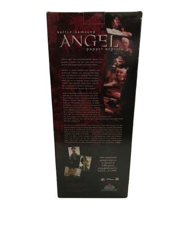 "Smile Time" Angel puppet replica. This replica was inspired by the popular Buffy the Vampire Slayer spin-off series, Angel. The puppet, a faithful recreation of Angel's transformation in the episode "Smile Time," features his signature dark hair, brooding expression, and leather jacket attire. The box highlights the show's title and the character's name, making it a must-have collectible for fans of the series. Numbered 125/5,000. Item has bee removed and returned to its box. Box in good condition. (22"x9")