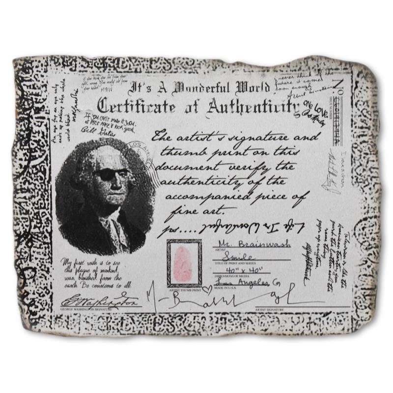 "Smile" is a mixed media original on deckle edge paper by Mr. Brainwash, hand signed by the artist. This piece is also hand signed inverso and bears the thumbprint of the artist. Includes Certificate of Authenticity. Measures approximately 40" x 40" (image).