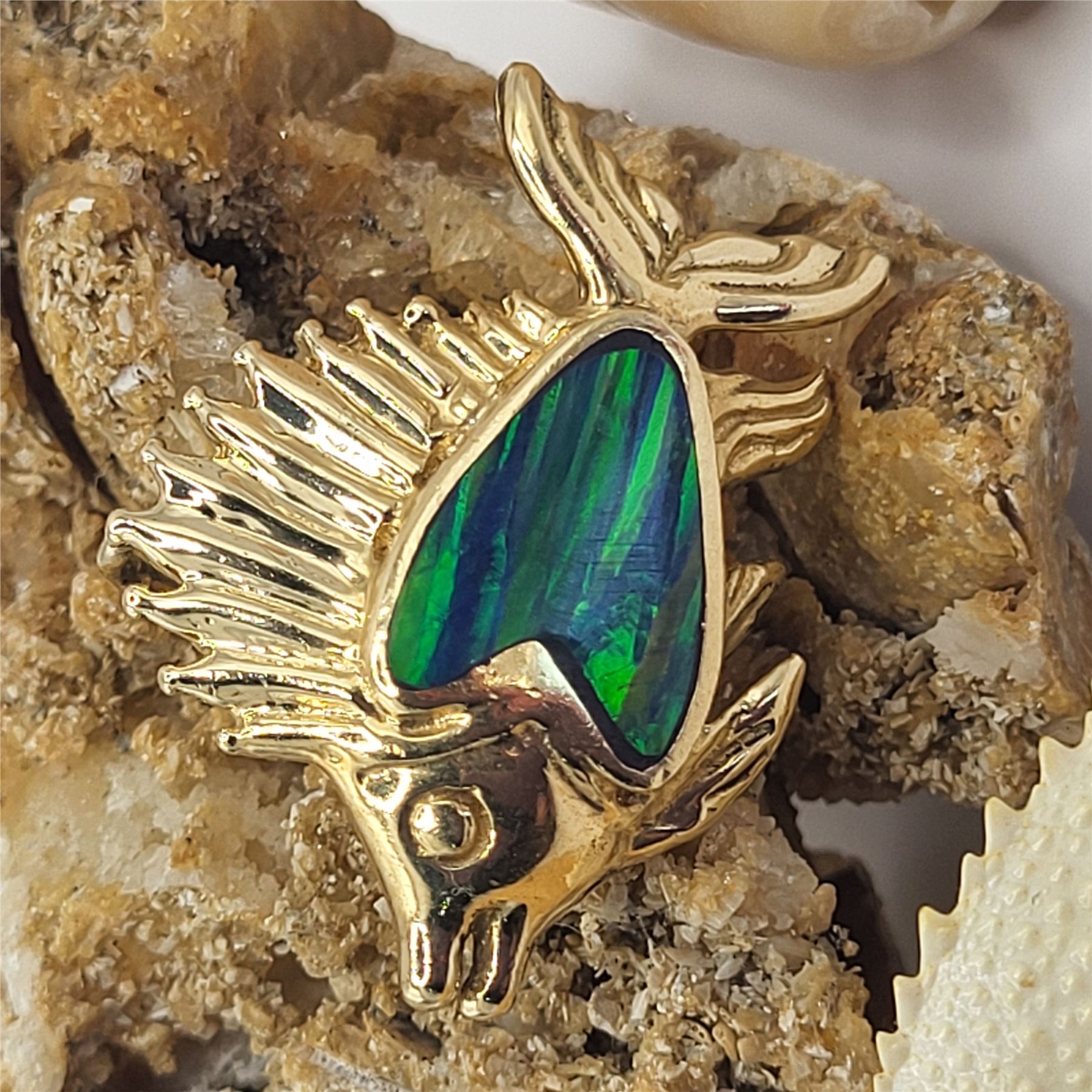 This is a lovely, whimsical and figural pendant. It is cast in 14 karat yellow gold as an adorable, smiling sailfish slide-style pendant, beautified with black opal inlay, possibly as a "doublet". T is 2-dimensional peProps used to aid in photography are NOT included in any lot, unless specified in the title and/or description.ndant is approximately 1 1/8" x 1 3/4" with a hidden bail that can accommodate an approximate 3.4mm wide chain. Bits of the "host rock" or doublet backing can be seen in the inlay. This is a brand new item that has been held in back stock. It is in excellent condition, but may have minor evidence of storage, such as fine scratches or patina.