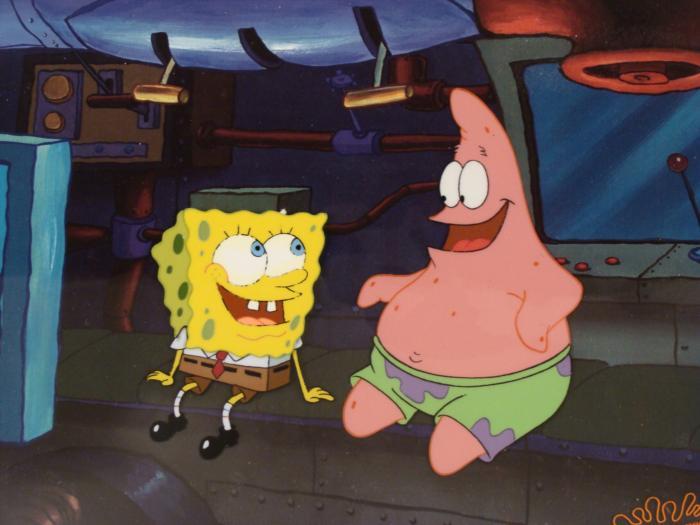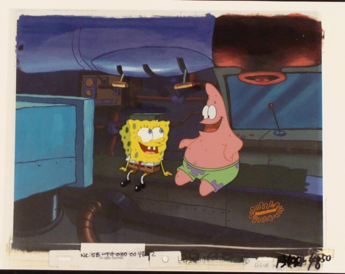 This animation cel and reproduction background are from the Nickelodeon TV show SpongeBob Squarepants. The story takes place under the deep blue sea in Bikini Bottom, where SpongeBob resides. SpongeBob, who is a yellow, porous sponge, is your typical happy-go-lucky character, as he is always cheerful and enjoys making people laugh. Patrick Star, SpongeBob's neighbor who is a starfish, is your average children's show idiot, as he boasts knowing nothing and is often getting himself into ridiculous situations. Between the homes of these two lies the home of the miserable Squidward, a squid, who is known for being grouchy and playing tricks on SpongeBob and Patrick. Both SpongeBob and Squidward work at the Krusty Krab, a fast food business run by the greedy money-loving Mr. Krabs, a crab, the arch rival of the evil, possibly misunderstood, Plankton. Another neighbor, Sandy Cheeks, an athletic squirrel who normally wears an astronaut's space suit, was introduced in "Tea at the Treedome." She spends most of her time inventing and experimenting. SpongeBob and Patrick are smiling.Original Printed Background and Animated Cel Overall Size of Background: 11" x 17" Overall Size of the Cel: 10 1/2" x 12 1/2" Very good condition This is an original hand-painted cel set-up used in the production of an episode of "SpongeBob SquarePants." Each one-of-a-kind set-up represents a slight change in position of the characters. When individually photographed and projected in rapid succession, the images appear to move.