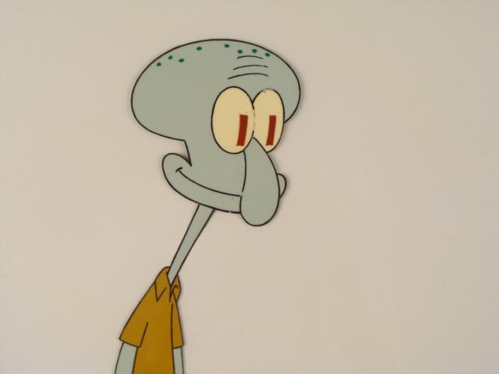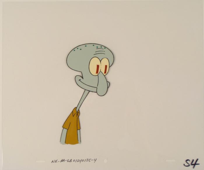 This original animation cel is from the Nickelodeon TV show SpongeBob Squarepants. The story takes place under the deep blue sea in Bikini Bottom, where SpongeBob resides. SpongeBob, who is a yellow, porous sponge, is your typical happy-go-lucky character, as he is always cheerful and enjoys making people laugh. Patrick Star, SpongeBob's neighbor who is a starfish, is your average children's show idiot, as he boasts knowing nothing and is often getting himself into ridiculous situations. Between the homes of these two lies the home of the miserable Squidward, a squid, who is known for being grouchy and playing tricks on SpongeBob and Patrick. Both SpongeBob and Squidward work at the Krusty Krab, a fast food business run by the greedy money-loving Mr. Krabs, a crab, the arch rival of the evil, possibly misunderstood, Plankton. Another neighbor, Sandy Cheeks, an athletic squirrel who normally wears an astronaut's space suit, was introduced in "Tea at the Treedome." She spends most of her time inventing and experimenting. In this cel is Squidward with a beaming smile. Original Production Animated Cel Overall Size of Cel: 10 1/2" x 12 1/2" Excellent Condition; minor outline wear around the eyesThis is an original hand-painted cel set-up used in the production of an episode of "SpongeBob SquarePants." Each one-of-a-kind set-up represents a slight change in position of the characters. When individually photographed and projected in rapid succession, the images appear to move.