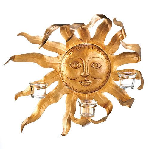 Smiling Sun Candle Sconce **|**|** A divine way to add glimmer and light to any room, the Smiling Sun Candle Sconce features three glass cups to hold the candles of your choice. The gleaming metal of the suns stylized smiling face and its seemingly wind-swept rays make for a stunning golden touch to your dcor. Item Weight: 1.4 lbs. 3-1/4 x 17" x 16" high. Metal and glass. 1 EA."
