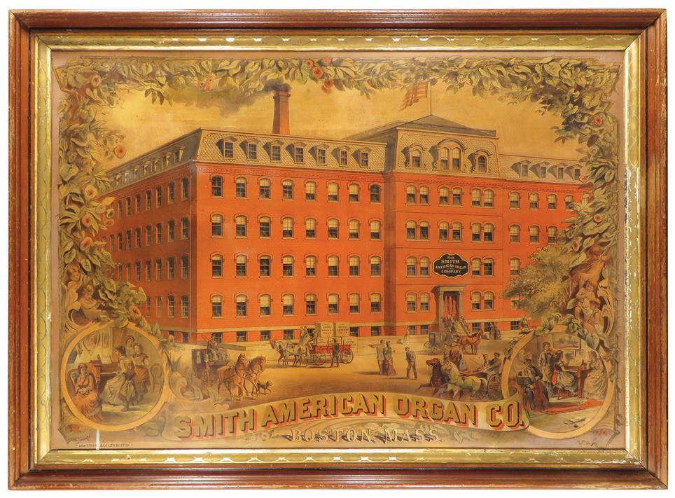 Smith American Organ Factory Scene Sign, Boston, Mass. Armstrong & Co. Litho Co. Restoration throughout. Framed under glass. 39 1/2 X 28 1/2 inches.