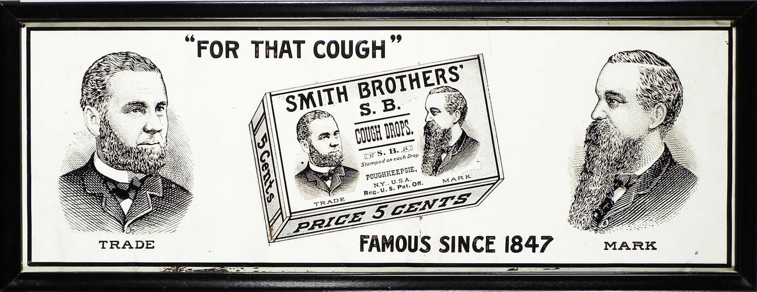 Smith Brothers Embossed Tin Sign in original frame. Entitled, "For that Cough". A few scratches and wrinkles otherwise very good condition. 29 X 11 inches overall.