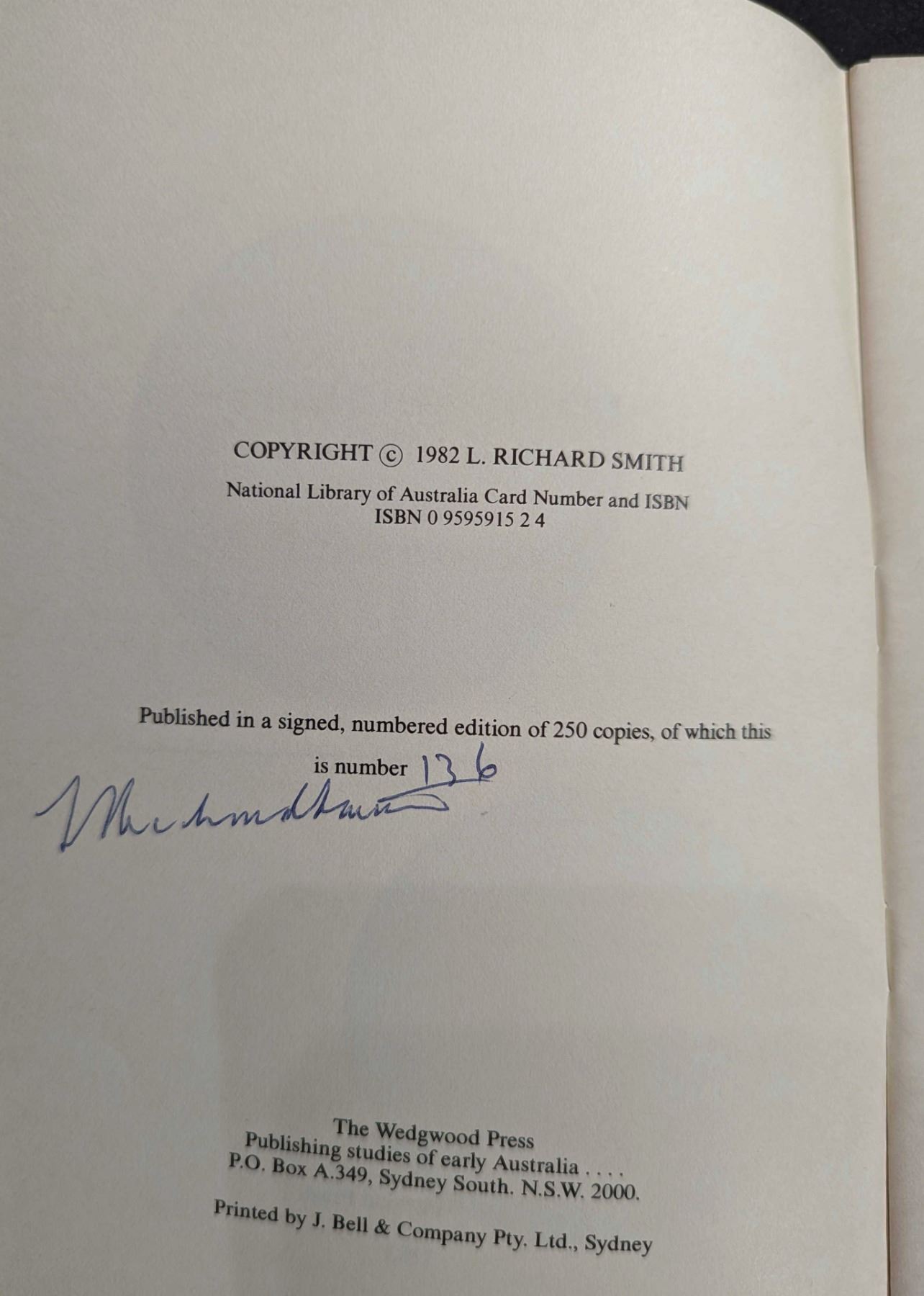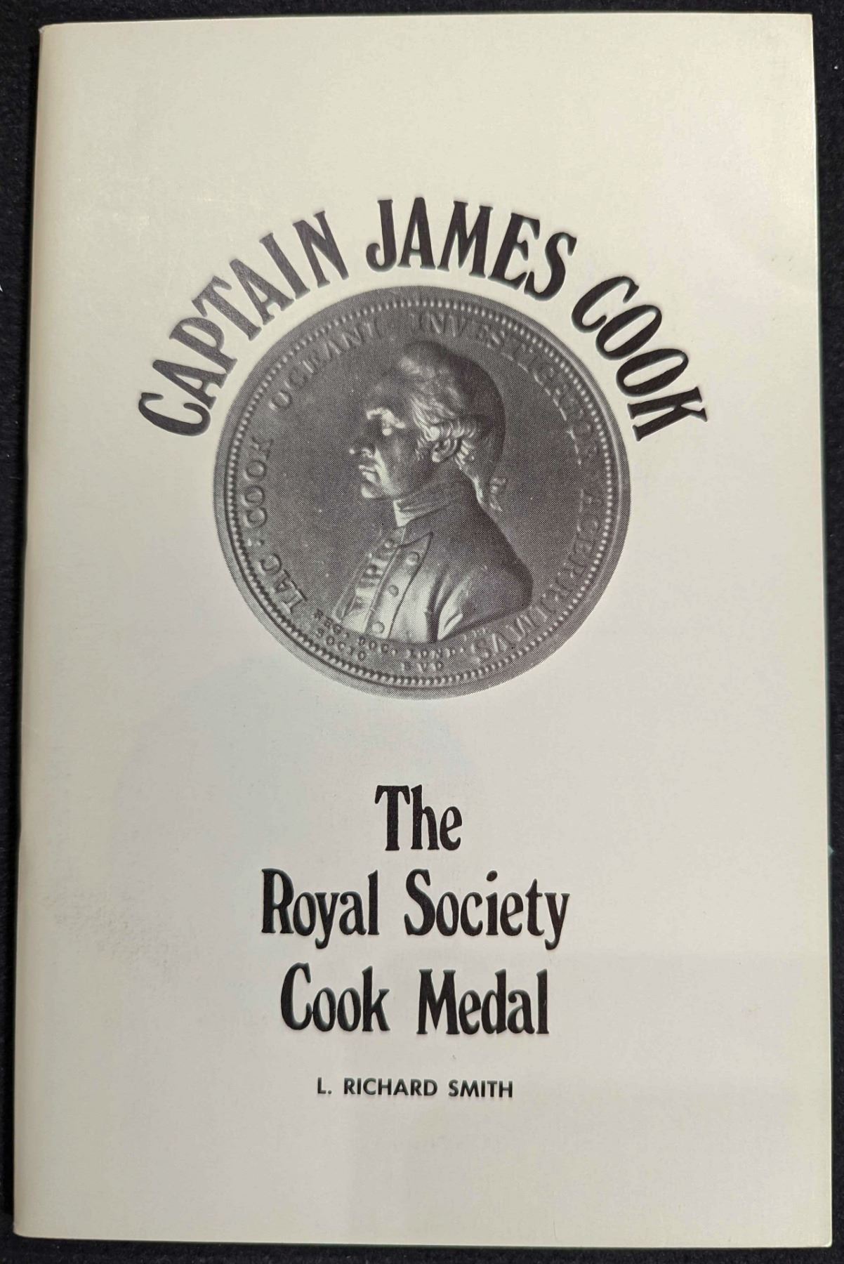Smith, L. Richard. CAPTAIN JAMES COOK - THE ROYAL SOCIETY COOK MEDAL. The Wedgewood Press. 1982. 12mo. 39 pages. Sydney. original printed card covers. b&w illustrations. Fine. Limited edition copy #136 of 250. Signed by the author. This book presents the manner in which the Royal Society of London honored the man who was arguably its most famous Fellow. The greater part of the story has been drawn from the contemporary records and documents held by the Royal Society of London. In 1848 Charles Weld, the Assistant Secretary and Librarian to the Royal Society, wrote "in looking over some old papers in the Archives, I was so fortunate as to find several interesting documents relating to Captain Cook's medal, which are now bound, and safely deposited in the Library." This volume has been extensively used, as have the minute-books of the Council of the Royal Society for the years 1780 to 1801. Extracts from these manuscripts which are now in the Library of the Royal Society are used by kind permission of the Council. Details the gold medal in the collection of Queen Elizabeth II are used by Royal permission. The author, throughout the text, used the more readily understood phrase member of the Royal Society in place of the more correct Fellow of the Royal Society. Also, in the cause of easy understanding, referred throughout to bronze medals, whereas these were in fact bronzed. An interesting history behind the commemoration of one of the world's most recognized explorers. Lot weight: 0 lbs 3oz. Subject(s): Australian Medals.
