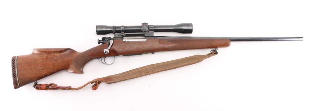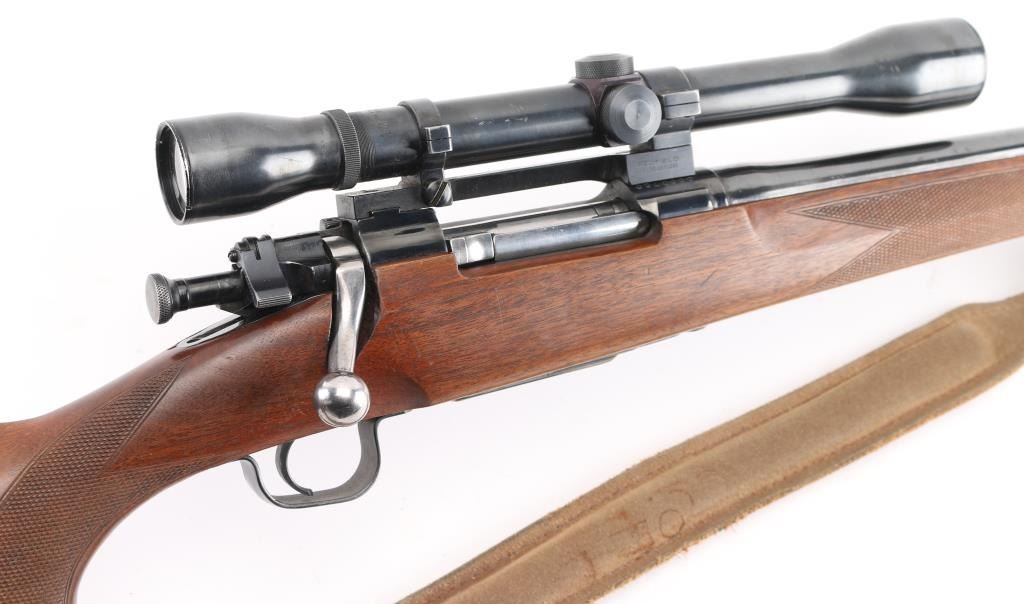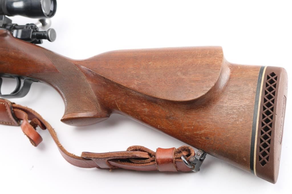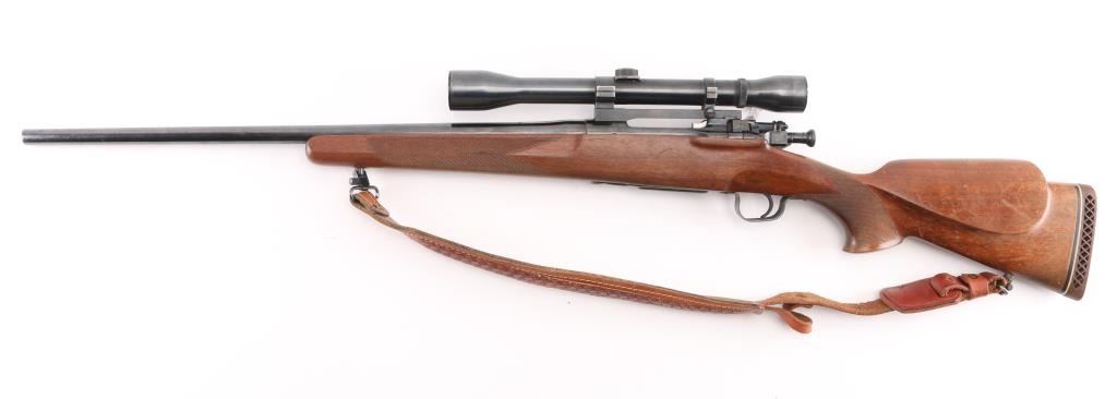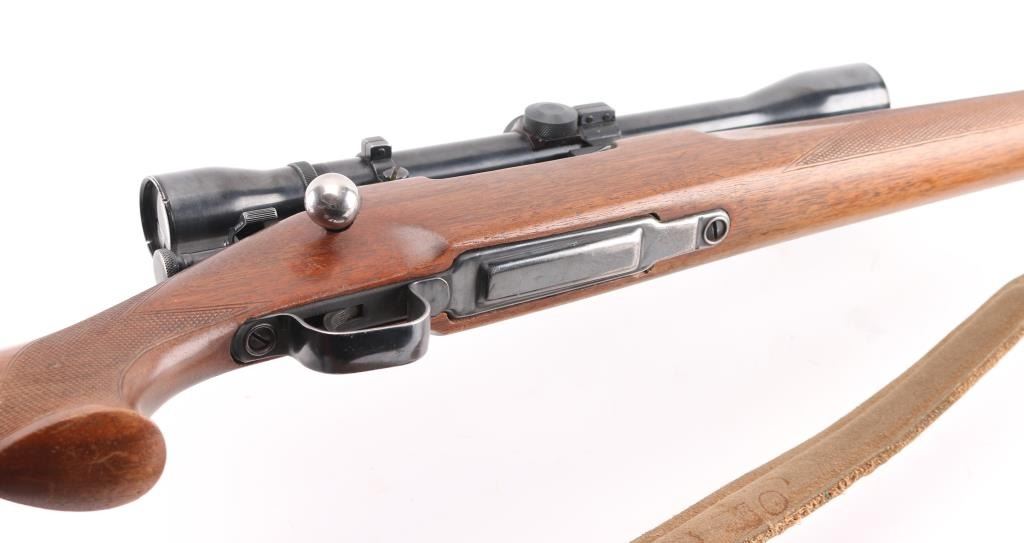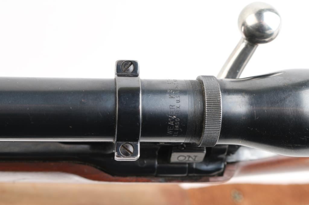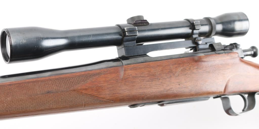 Sporterized US Military bolt action rifle features 22" shortened barrel, receiver drilled & tapped for Redfield one piece scope base,chrome bolt, & bent bolt handle, manual safety, blued finish, nice Monte-Carlo style stock with shadow line cheek piece,checkered grip & forearm, ventilated rubber recoil pad. Mounted with a vintage Weaver K6 scope, clear optics. Bore is ok, with light areas of pitting, rifling present, needs cleaned. Metal surfaces retain 80% bluing with edge losses, handling marks, handling loss on bottom metal. Wood is good condition/sound, with finish loss on the buttstock. Includes padded leather sling. NRA Condition-Good. C&R Firearm.