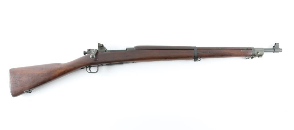 U.S Military WWII era bolt action rifle features parkerized arsenal re-finish, wood handguard & straight grip stock, blade front sight with protector installed, peep rear sight, bayonet lug, 24" barrel, three position safety, magazine cut-off, sling swivels, stacking swivel. Barrel marked "SC flaming bomb 6-43" Front sight marked "C64157-4. Bore is very good condition. Retains 95% finish on metal parts.. Wood is very good condition. Visible stock cartouches include: "P" proof, and "OG" (Ogden Armory). Condition is NRA Very Good (arsenal rebuilt) C&R Firearm.