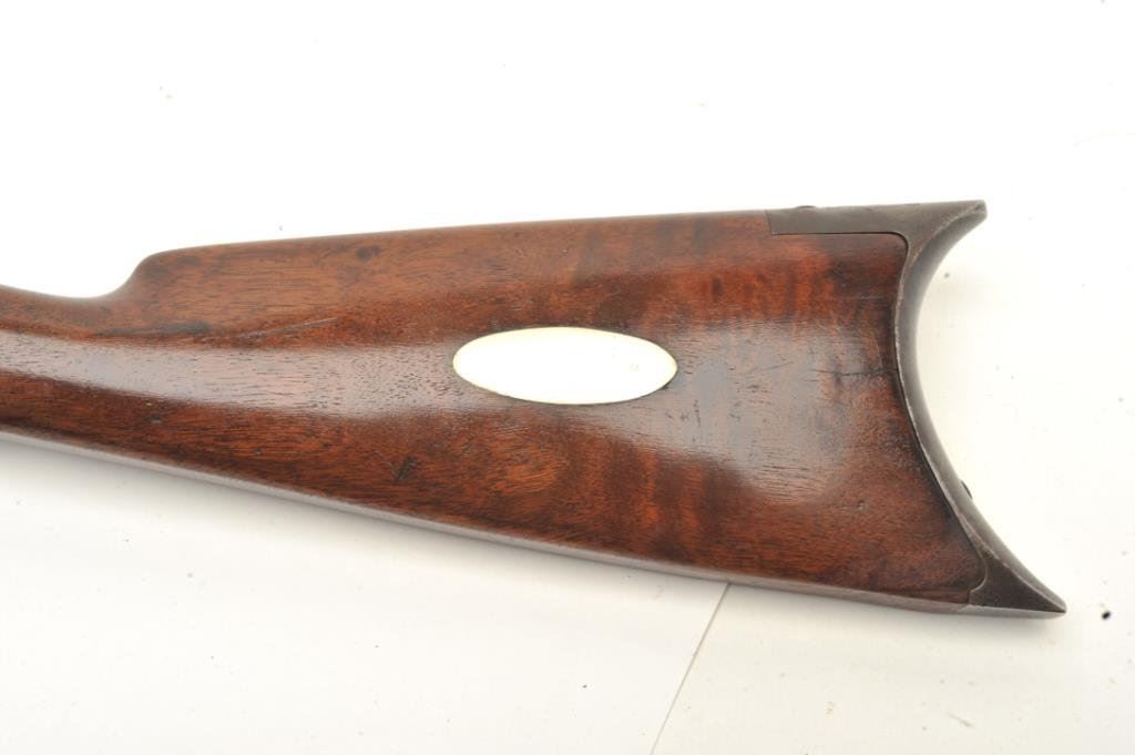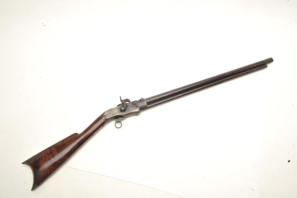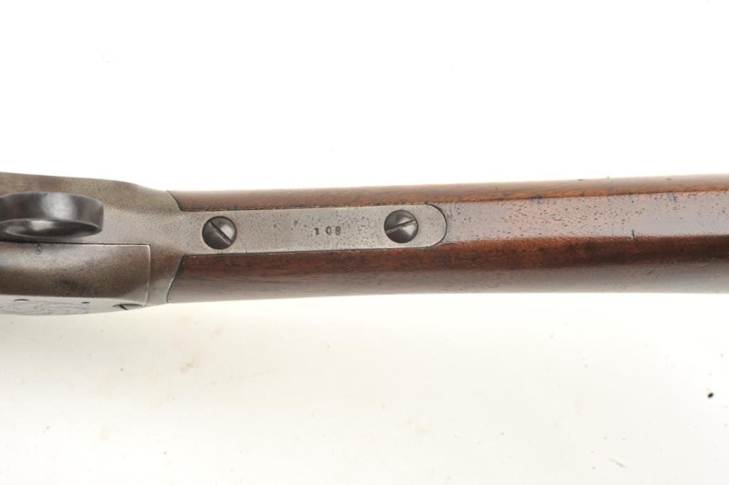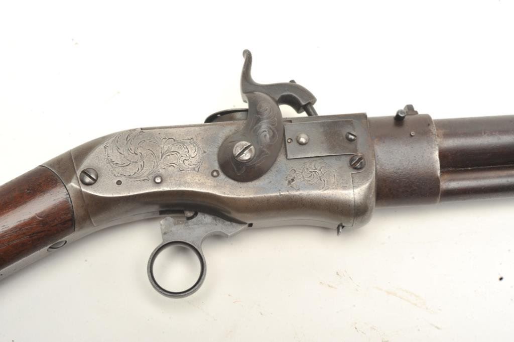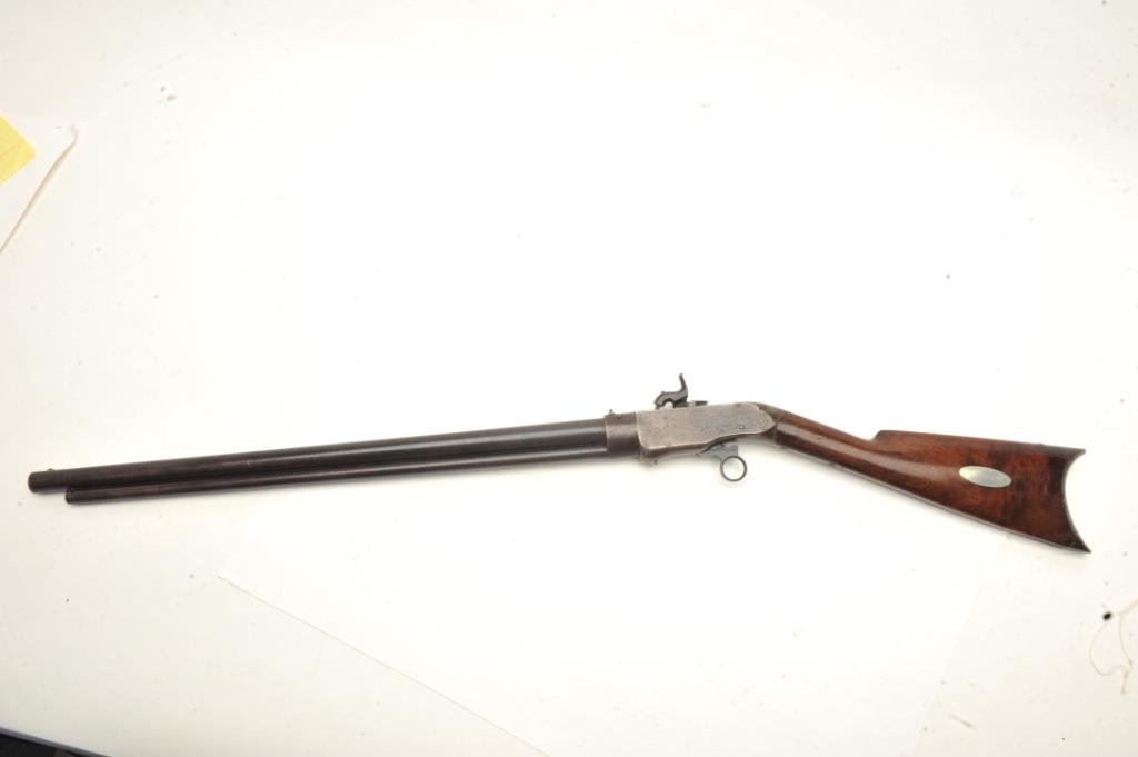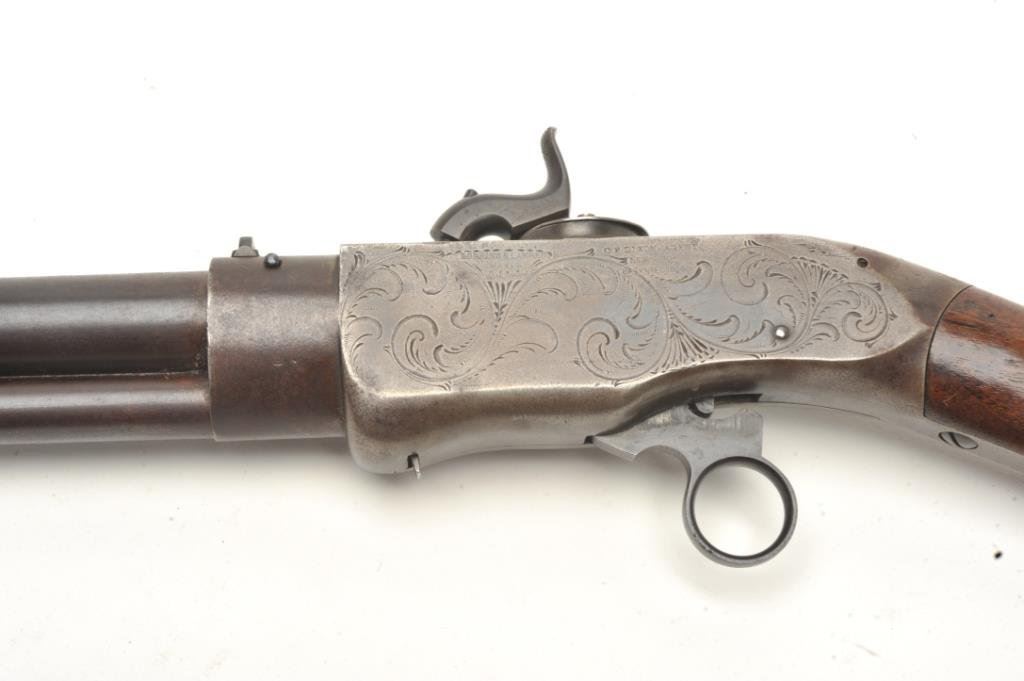 pill magazine for “Rocket Ball” ammunition, S/N 108. Engraved frame with 25” barrels and 44 ½” overall. In very good plus to near fine original condition with 50%-70% original blue turning plum on the frame, barrel and magazine. Some minor erosion and pinprick pitting just starting. Good markings and visible 1849 patent date. The stock is also at least very good with some rubbing or oiling but fits up nicely and shows some select grain. This model arm was the grandfather of the Volcanic and Tyler Henry was the foreman of the factory. “The Jennings is important to Winchester evolution because it served to bring together the talents of Tyler Henry, Horace Smith and Daniel Wesson. Their combined efforts led ultimately to quite historic developments in lever action repeating firearms”. See Flayderman 5K-004. (Antique) Est.: $10,000-$20,000