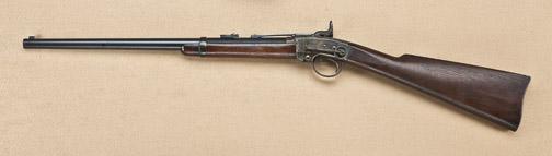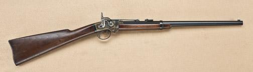 Smith Poultney and Trimble, .52 caliber breech-loading carbine in fine to near excellent original condition, serial #6248. The barrel shows 95-98% original blue, some beginning light erosion and pinprick pitting just starting and some slight drifting to patina. The frame shows 85-95% case hardening, slightly dulling and starting to grey and silver. The latch shows 95% bright blue, the stocks are fine to excellent and show two razor sharp cartouches. The triggerguard shows 75-85% blue, the butt shows traces of case hardening going to grey with some erosion. The barrel band shows 30-40% darkened original blue. The saddle ring, small parts, and sights are all retained. The action is crisp, the bore excellent, and the carbine shows no use, just slight storage and minor discoloration. Est: $1,750 - $3,500