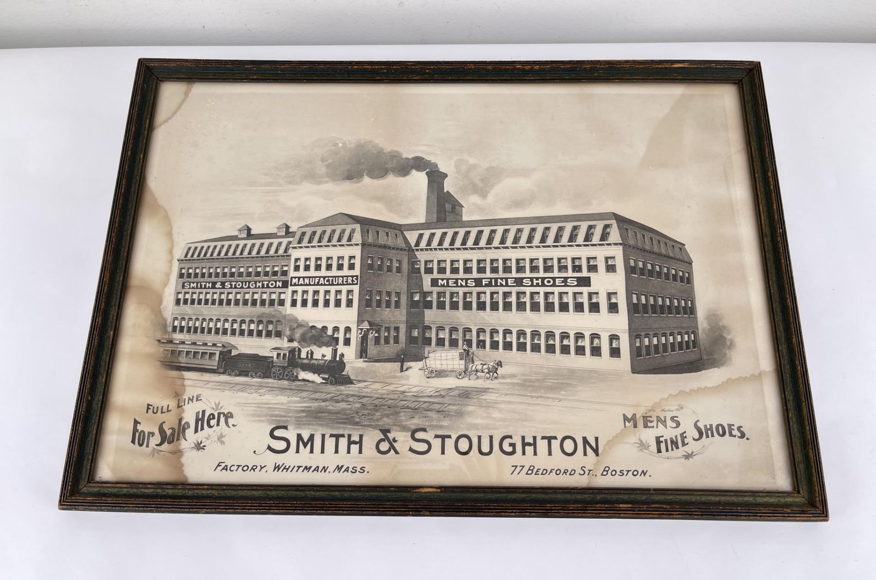 Wonderful early sign. Smith and Stoughton Factory Whitman Massachusetts. 18 1/2" by 26 1/2" framed.