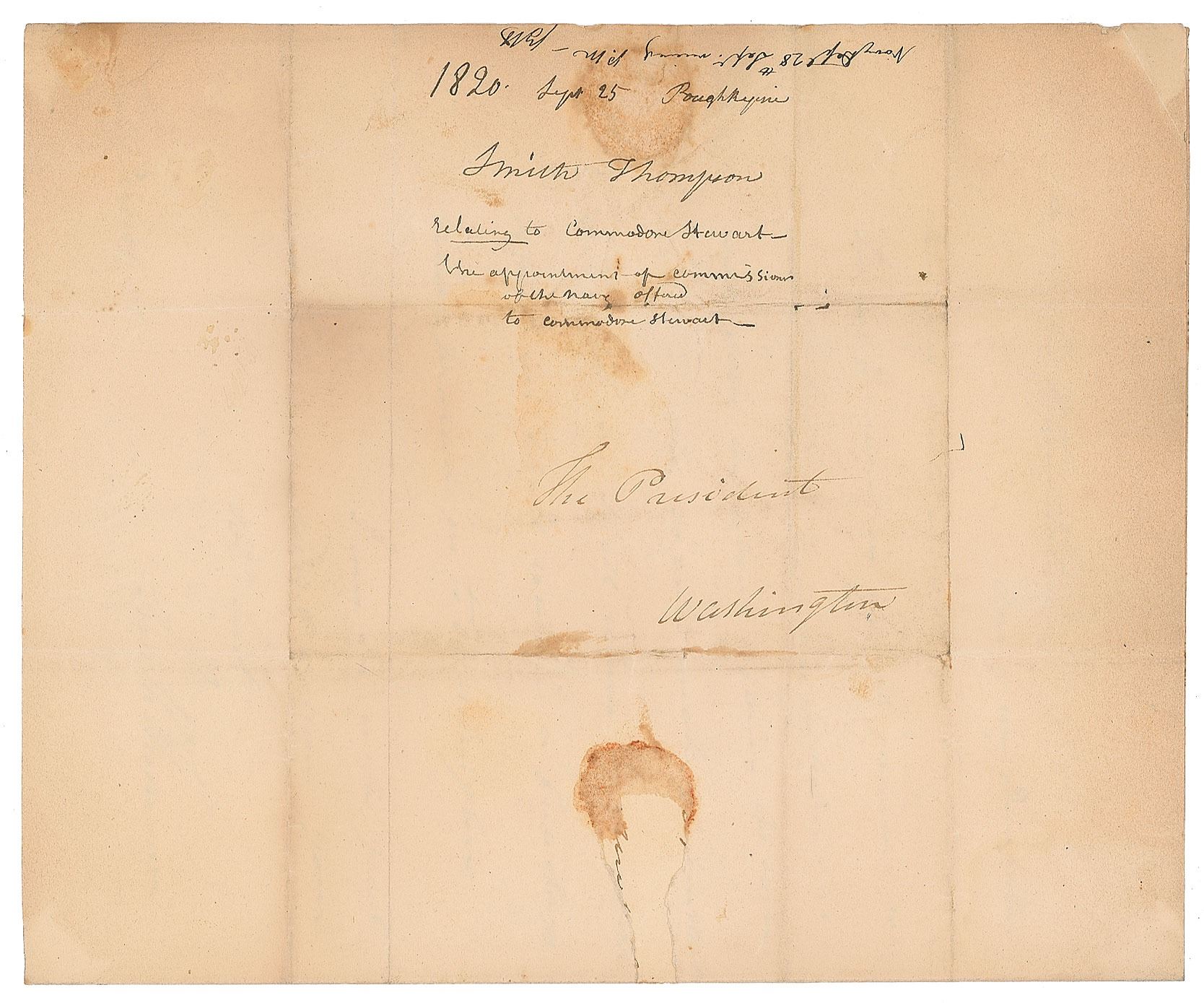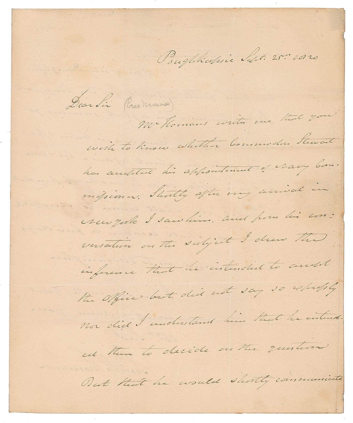 ALS, one page both sides, 7.75 x 9.5, September 25, 1820. Letter to President James Monroe, in part: "Mr. Homans writes me that you wish to know whether Commodore Stewart has accepted his appointment of Navy Commissioner. Shortly after my arrival in New York I saw him, and from his conversation on the subject I drew the inference that he intended to accept the office but did not say so expressly nor did I understand him that he intended then to decide on the question, but that he would shortly communicate to me his determination." He goes on to mention his daughter's illness and upcoming plans to travel to New York and Washington. In very good to fine condition, with light overall creasing, and seal-related paper loss to the integral address leaf.