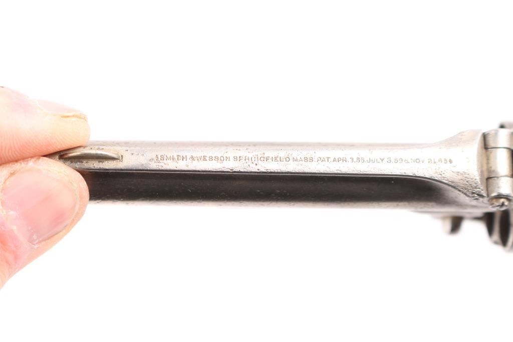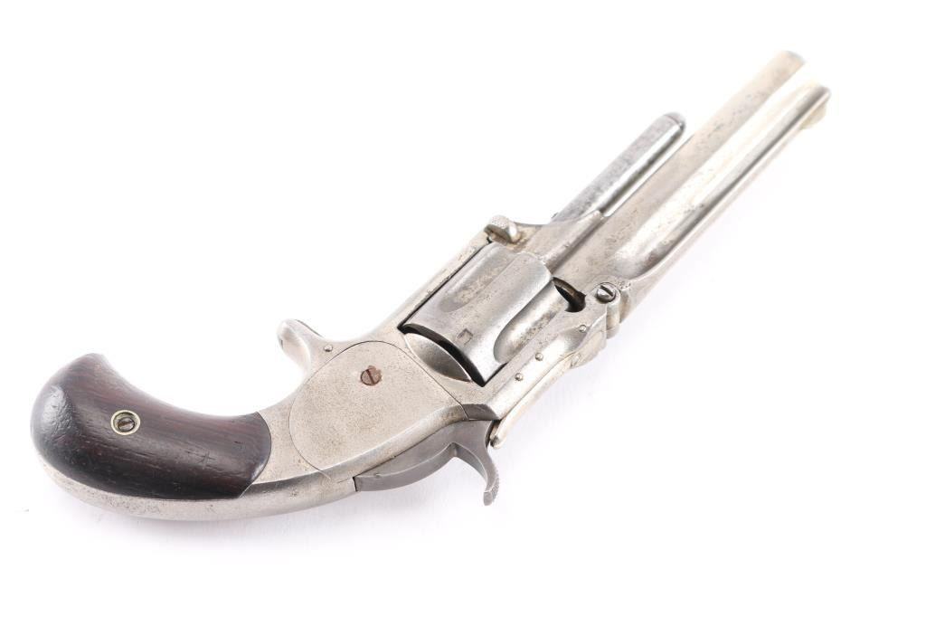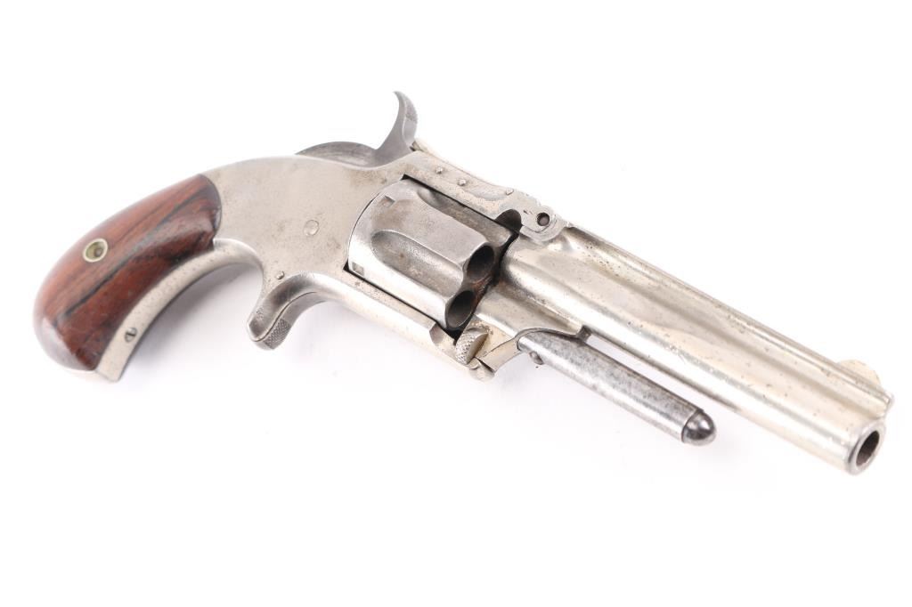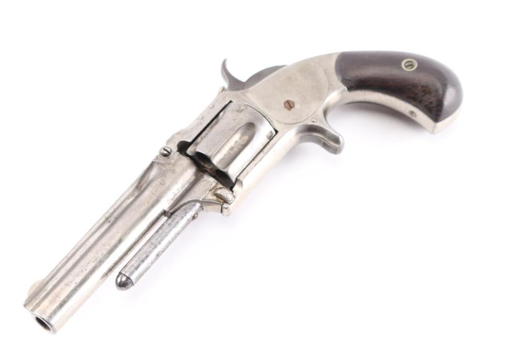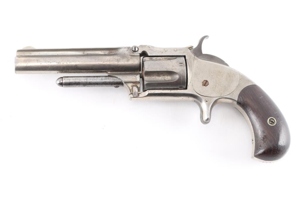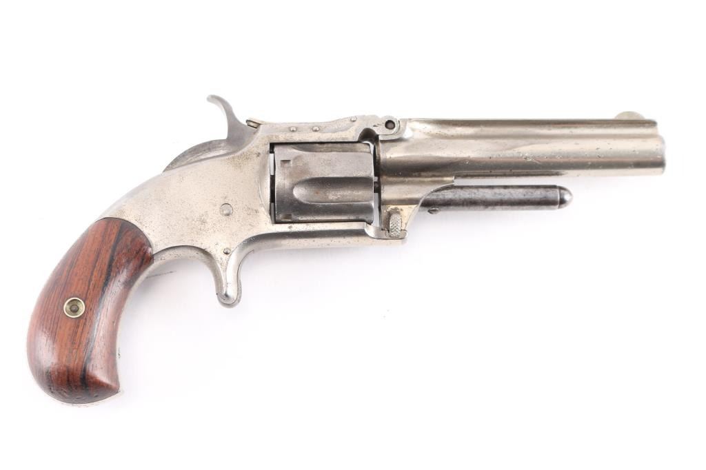 S&W 1 1/2 .32 rimfire single action revolver. Fair to good overall w/ scattered pitting and approximately 30% original nickel. The bore is fair, the rosewood grips are good. The markings are good and the