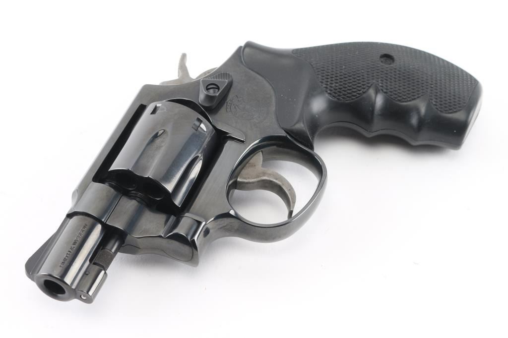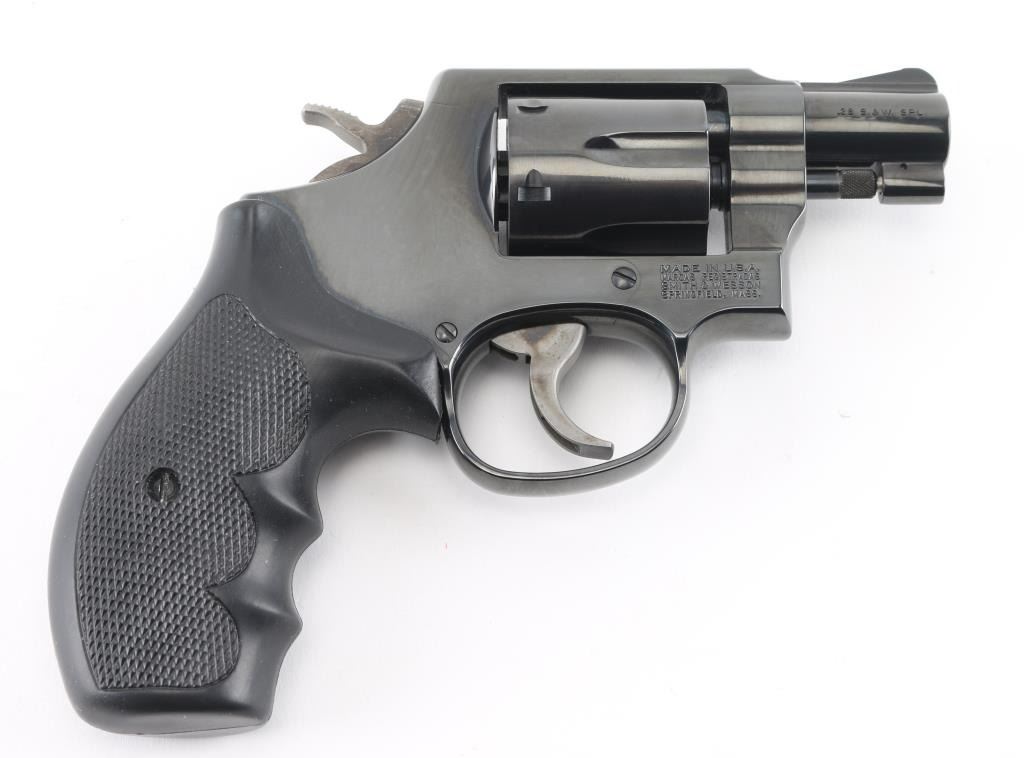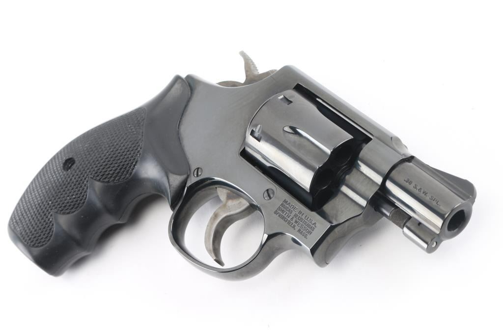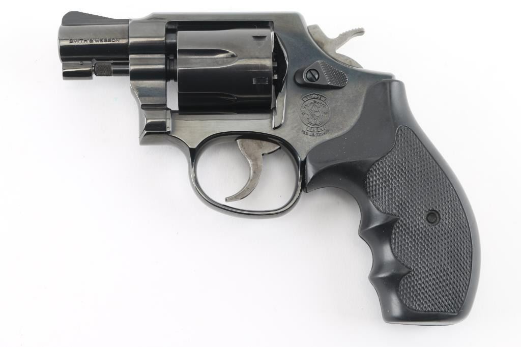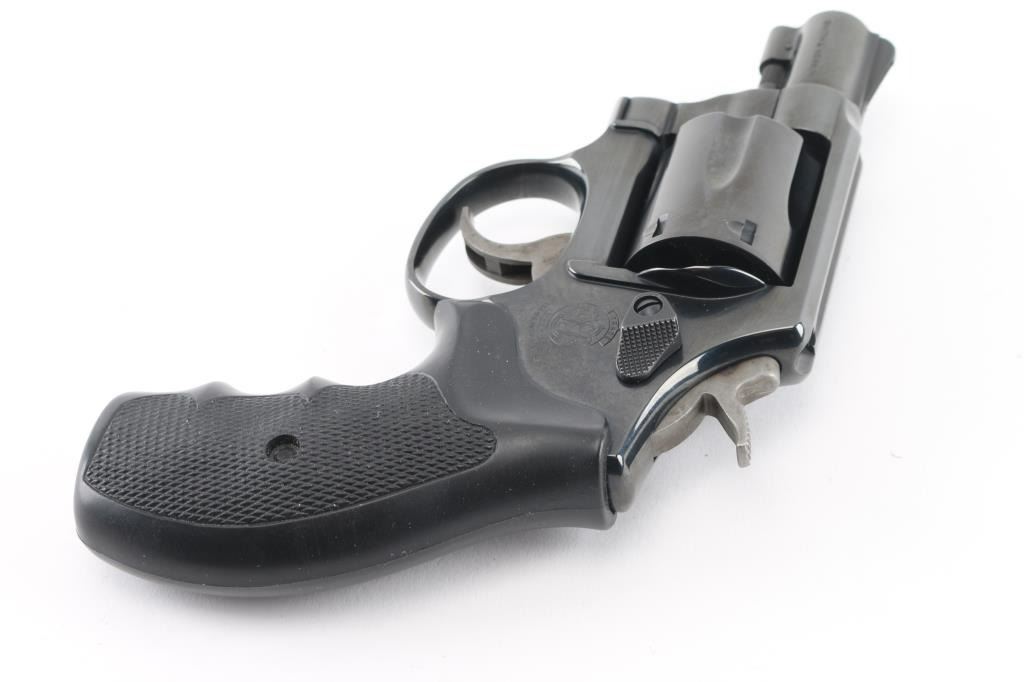 American made 6 shot revolver chambered for .38 Special ammunition. It has a blued finish, fluted cylinder, 2" barrel, serrated ramp front sight, notch rear sight, smooth trigger, knurled hammer spur, and black, rubber finger groove "checkered" grips. Bore and cylinders look great. Metal finish looks great. Grips are fine. Condition is NRA Excellent *Modern Firearm*