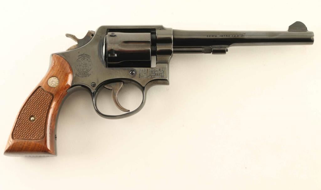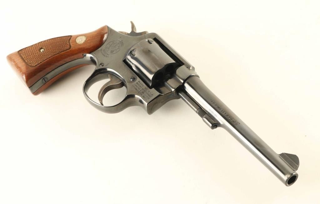 'Military & Police', Pinned Barrel, older all machined construction. Medium frame double action revolver. Features a blued finish, 6" tapered barrel with serrated ramp front sight, square notched rear sight, non-shrouded ejector rod, fluted six-shot cylinder, serrated trigger, service hammer with knurled spur, three screw square butt K frame and two-piece checkered walnut Magna grips with silver S&W medallions. Bore and charge holes are very good. Retains 95% blue with bare metal visible at muzzle and some corners of frame. Grips are very good with few scratches. Action is smooth with tight lock-up. Condition is near NRA Excellent *** Modern Firearm ***
