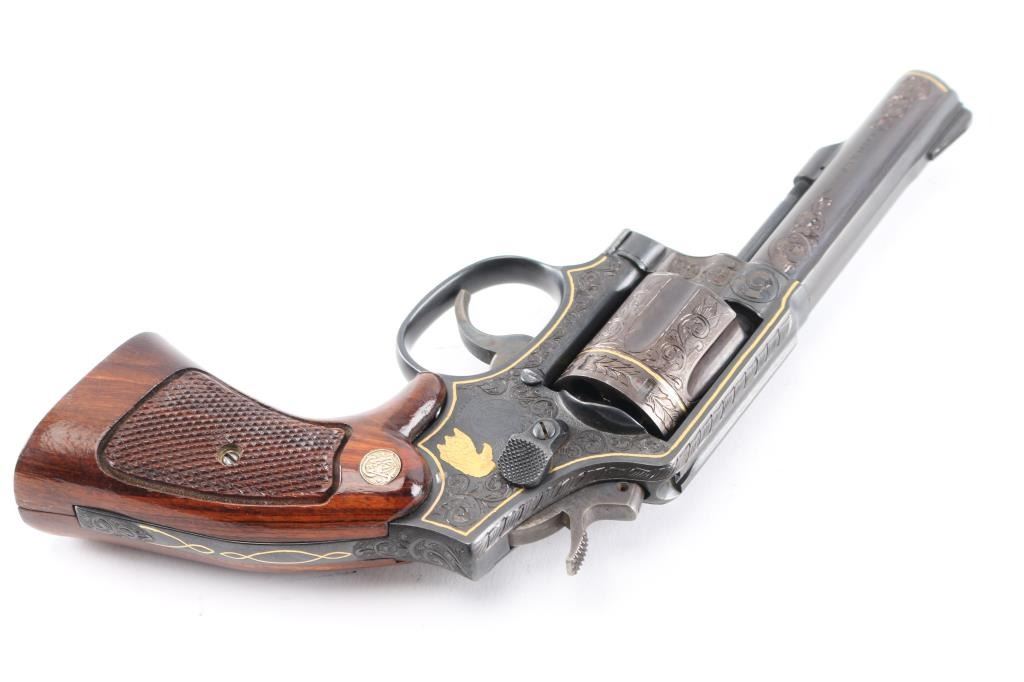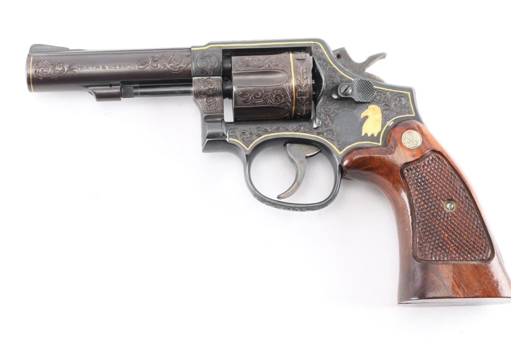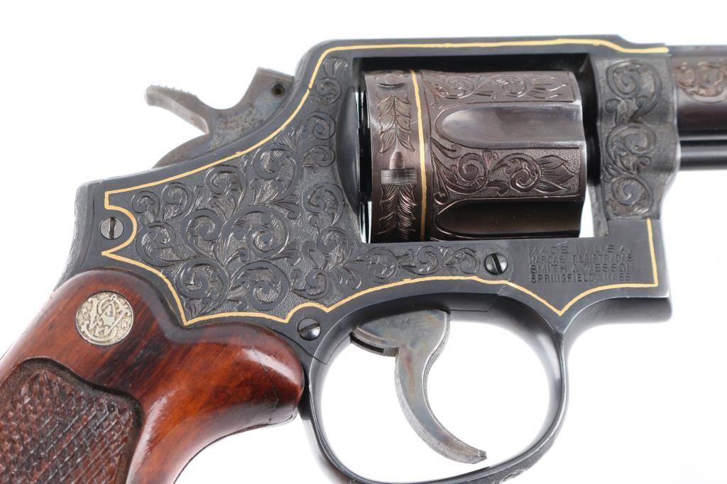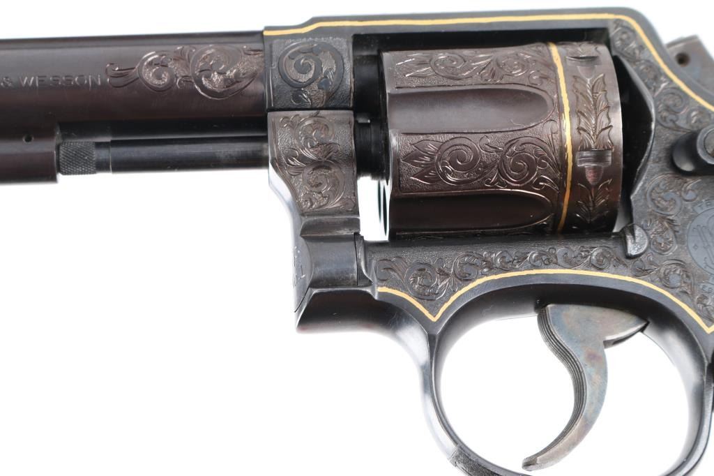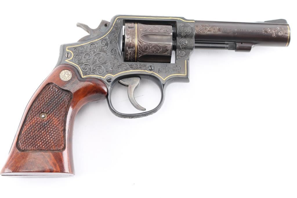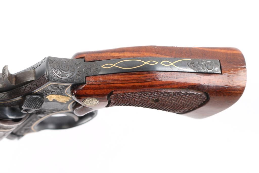 SN: AYV5842. Medium frame double action revolver. Features a blued finish, 4" barrel, forged blade front sight, square notched rear sight, four screw square butt K service frame and two-piece checkered target wood grips with silver S&W medallions. Full coverage 'bank note' scroll engraving with gold inlaid borders on frame, muzzle and cylinder. Gold geometric designs on backstrap and gold inlaid American eagle head on left frame. The front of the crane is marked with an intertwined "TF No. 1". ( Tom Freyburger ?) Can't say for if is factory engraved. (No letter). Overall excellent condition, bore is excellent/bright, Comes in a S&W factory walnut presentation box.