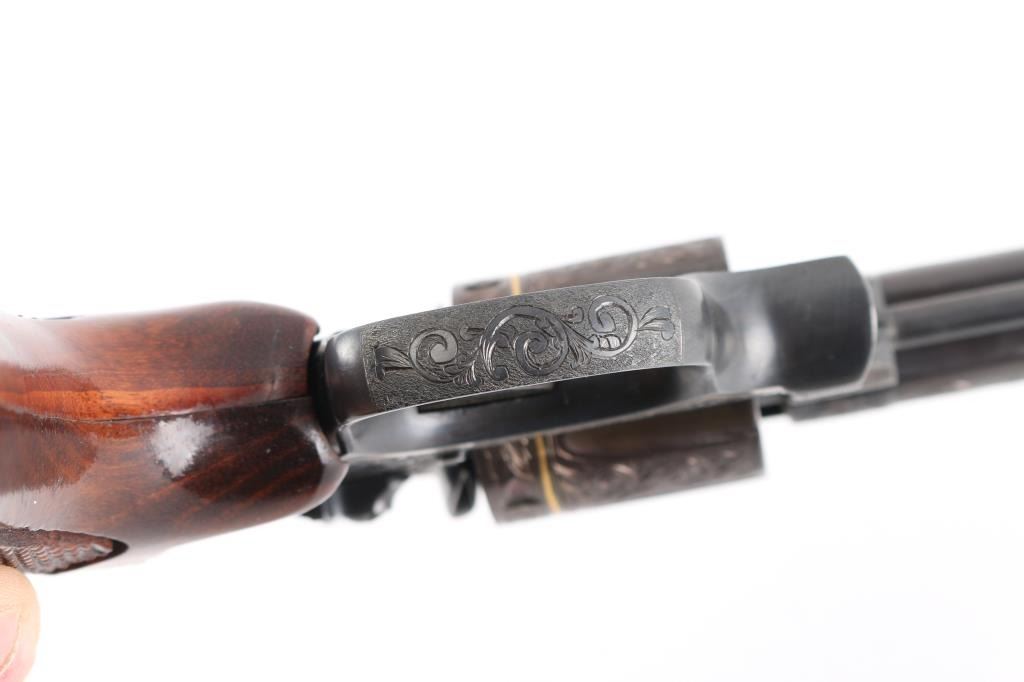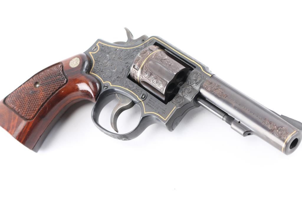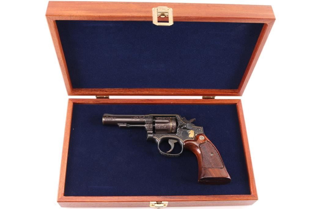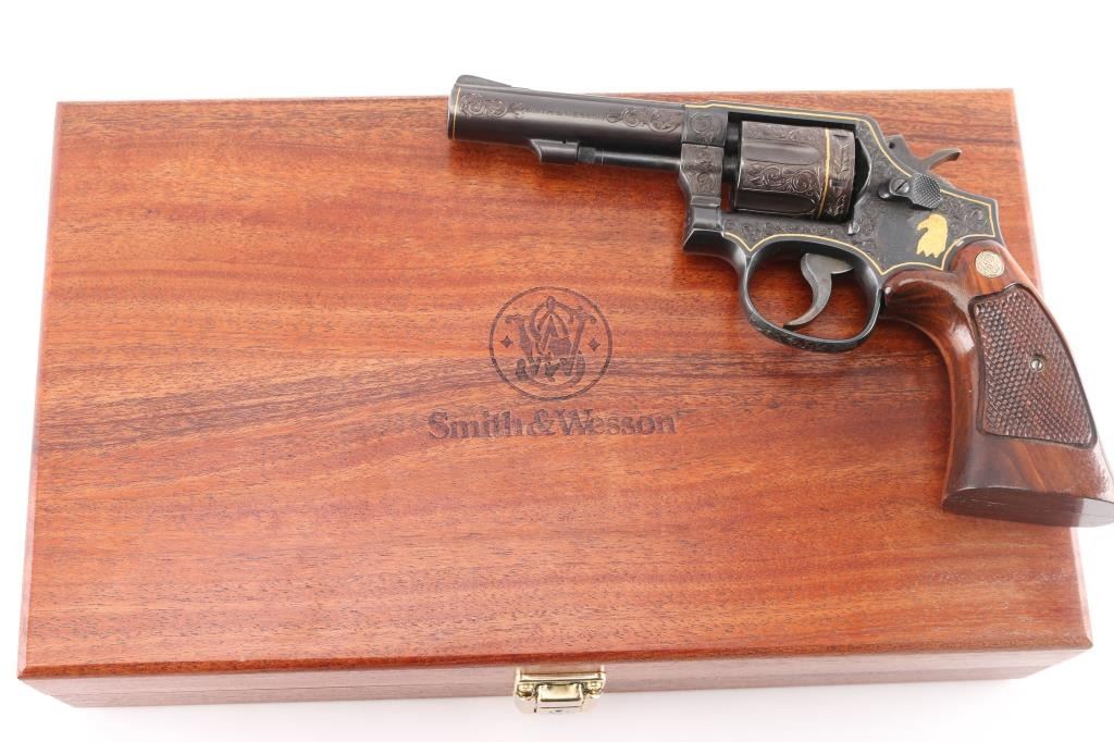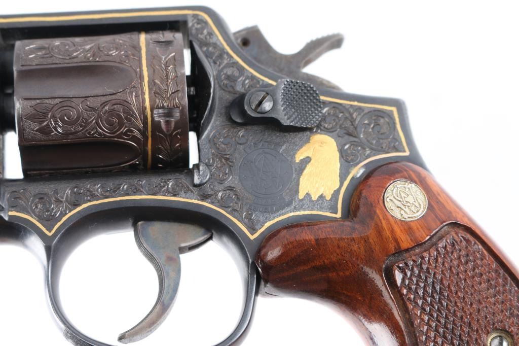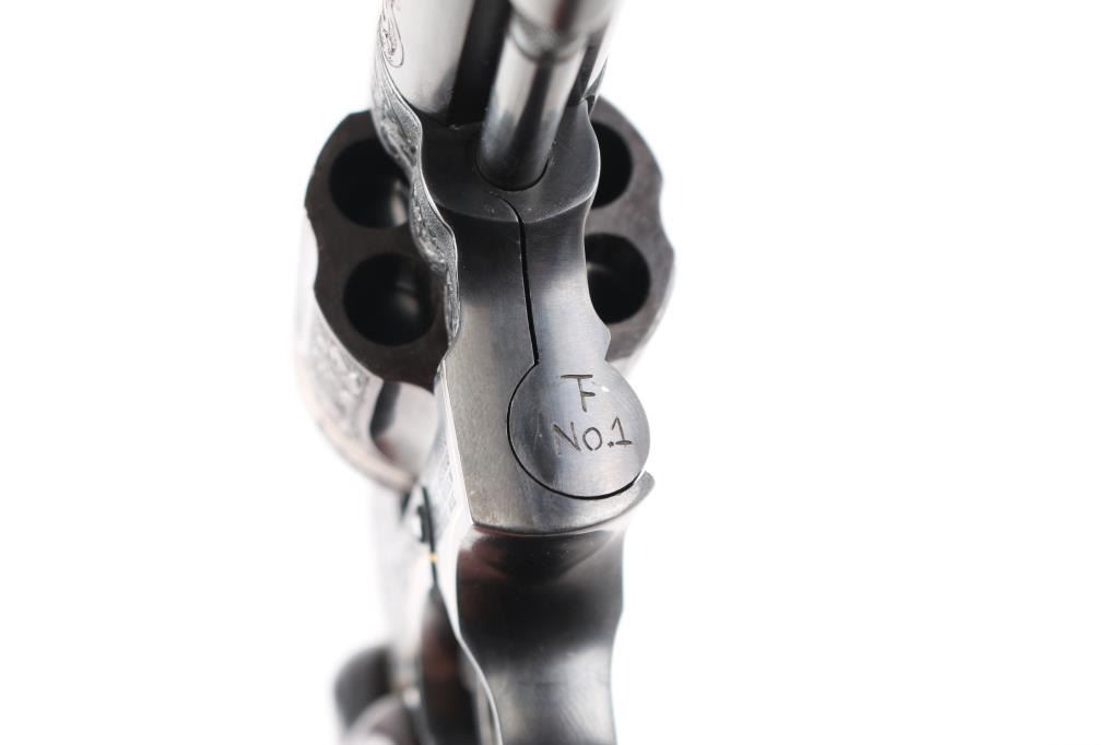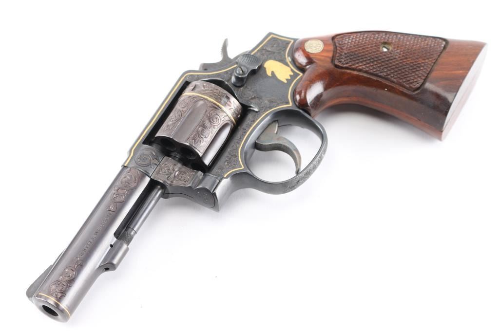 SN: AYV5842. Medium frame double action revolver. Features a blued finish, 4" barrel, forged blade front sight, square notched rear sight, four screw square butt K service frame and two-piece checkered target wood grips with silver S&W medallions. Full coverage 'bank note' scroll engraving with gold inlaid borders on frame, muzzle and cylinder. Gold geometric designs on backstrap and gold inlaid American eagle head on left frame. The front of the crane is marked with an intertwined "TF No. 1". ( Tom Freyburger ?) Can't say for if is factory engraved. (No letter). Overall excellent condition, bore is excellent/bright, Comes in a S&W factory walnut presentation box.