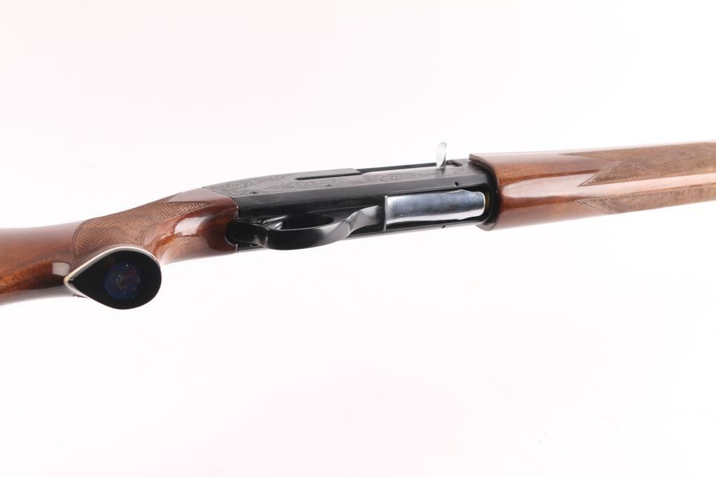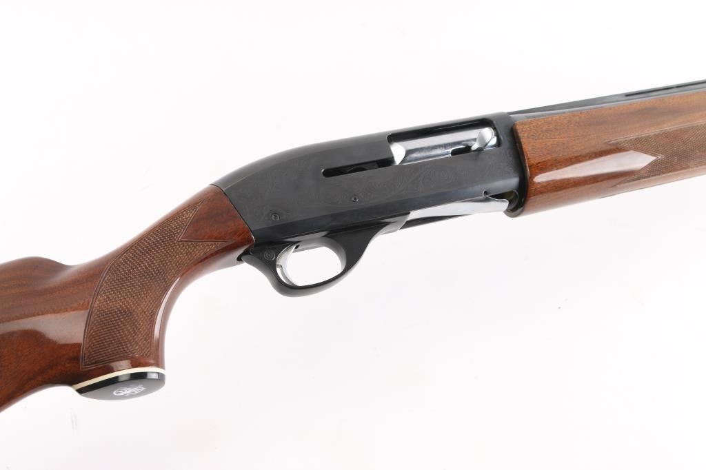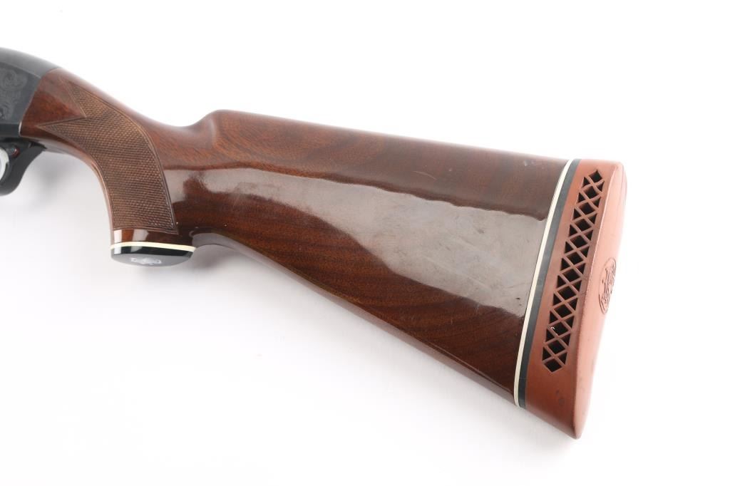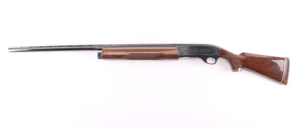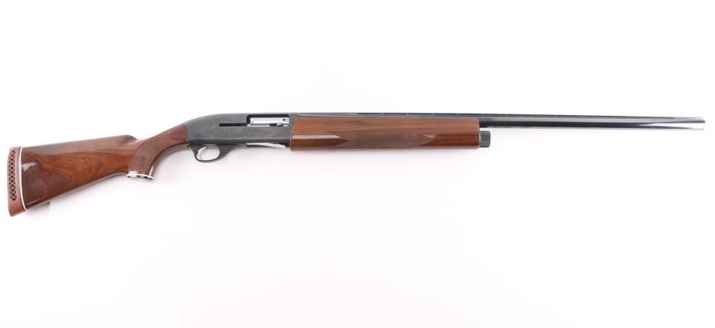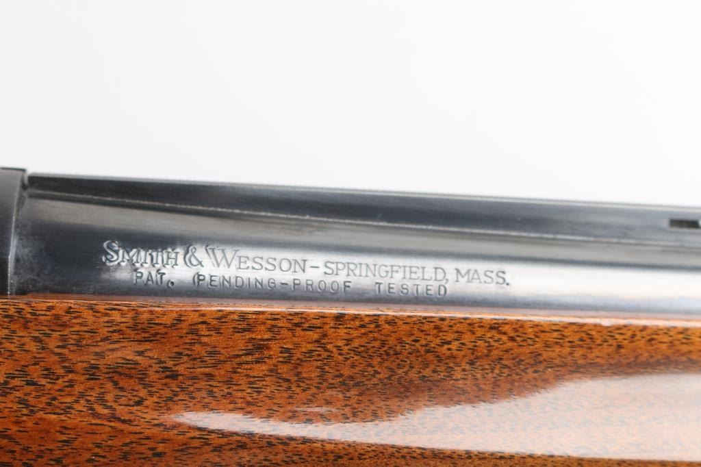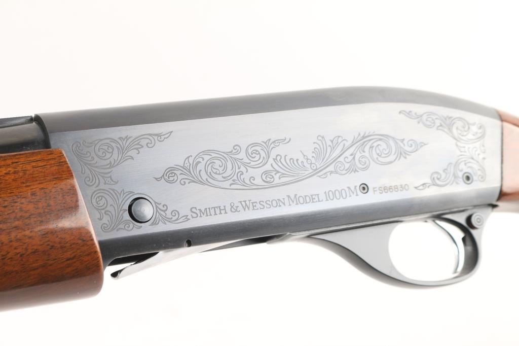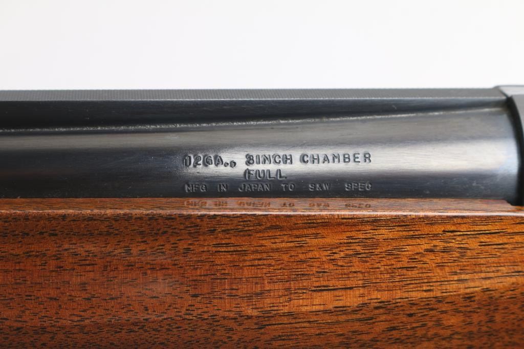 Gas operated semi-automatic shotgun chambered for 2 3/4" & 3" 12 gauge shells, manufactured in Japan by Howa circa 1972-1984. Features a blued fixed full choke 30" vent rib barrel, steel bead sights, 1/2 length tube magazine, smooth trigger, push button safety, polished bolt, serrated charging handle, engraved alloy receiver, checkered walnut forend and pistol grip shoulder stock with S&W grip cap and factory recoil pad. Shotgun exhibits edge wear. minor scratches, approximately 90% bluing retained. Action is smooth, the bore is pristine and the high gloss wood stocks are very good with sharp checkering, some minor scratches/scuffs.