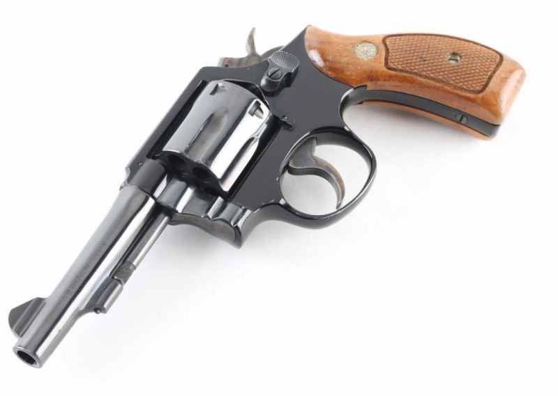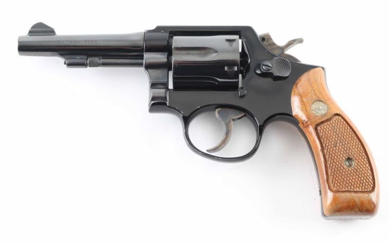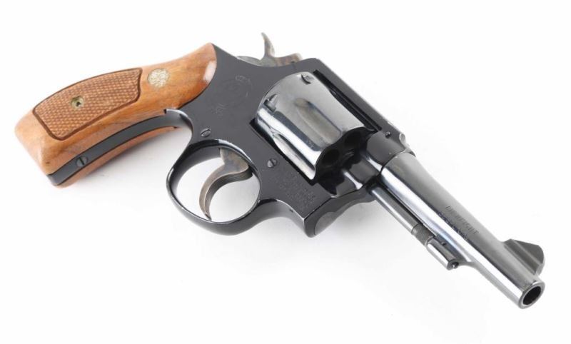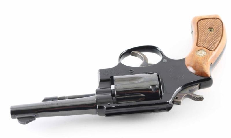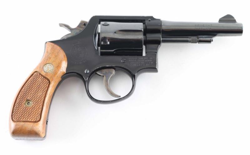 'The .38 Military & Police Airweight' Lightweight medium frame double action revolver. Features a blued/glossy black finish, 4" barrel, forged blade front sight, square notched rear sight, non-shrouded ejector rod, fluted six-shot cylinder, serrated .240" trigger, .240" hammer, three screw round butt K alloy service frame and two-piece checkered wood Magna grips with silver S&W medallions. Bore is very good condition. Revolver retains approximately 90% of it's original finish showing scattered handling wear and a light drag line on the cylinder. Action is smooth with tight lock up. Grips are very good condition. Condition is near NRA Excellent *** Modern Firearm ***