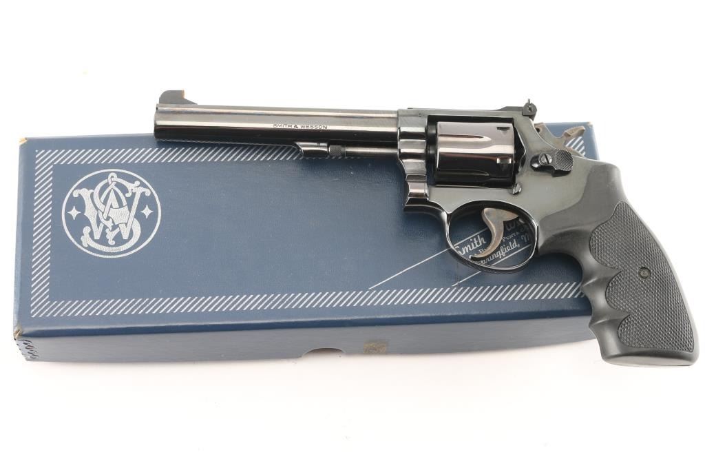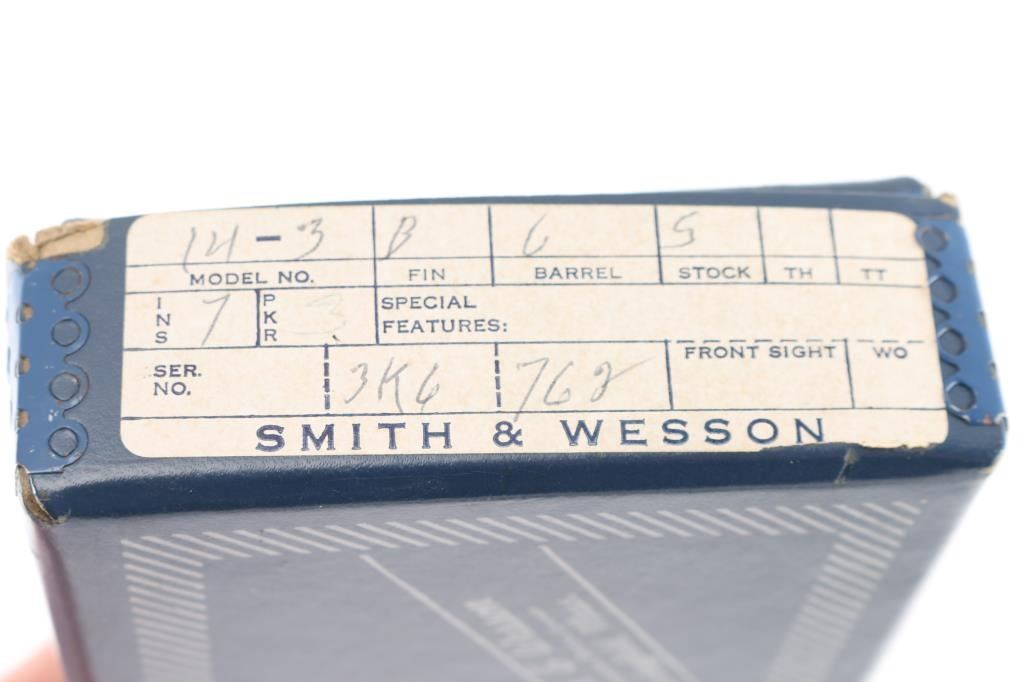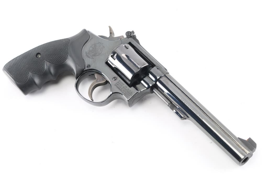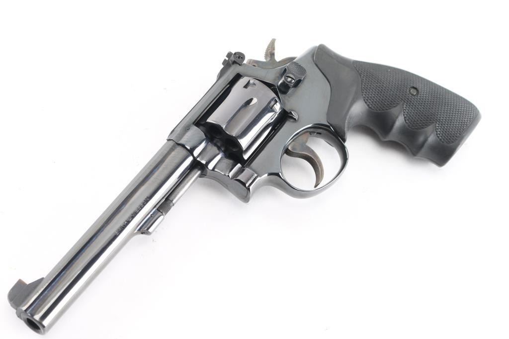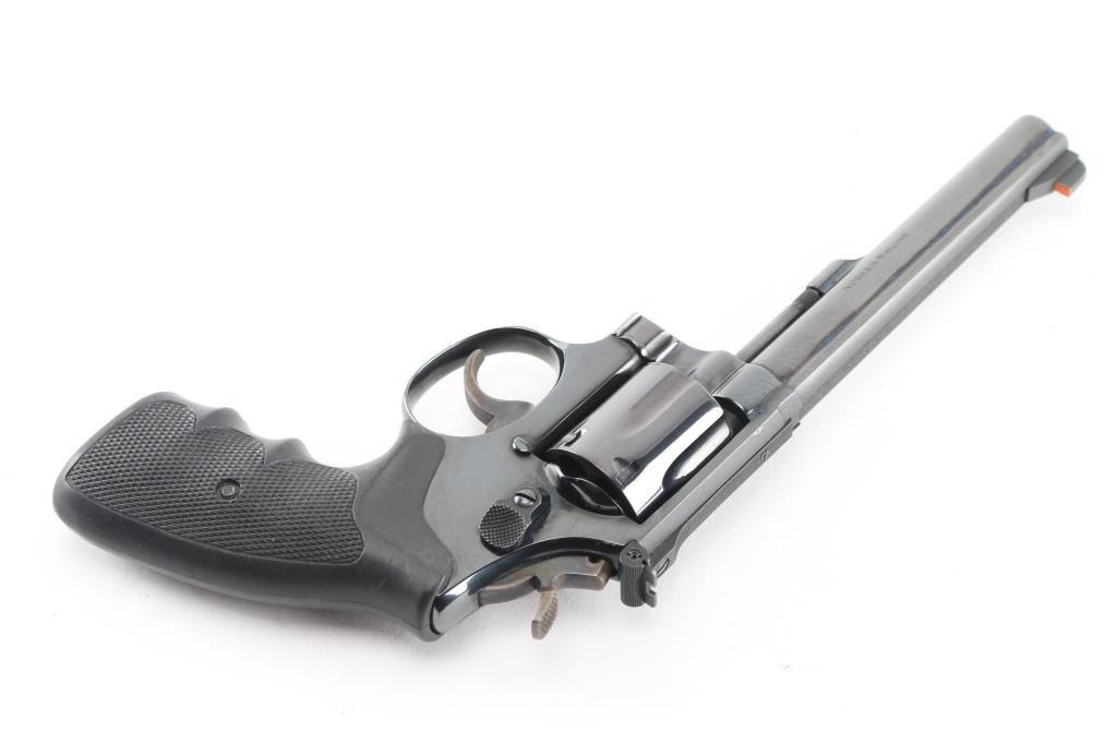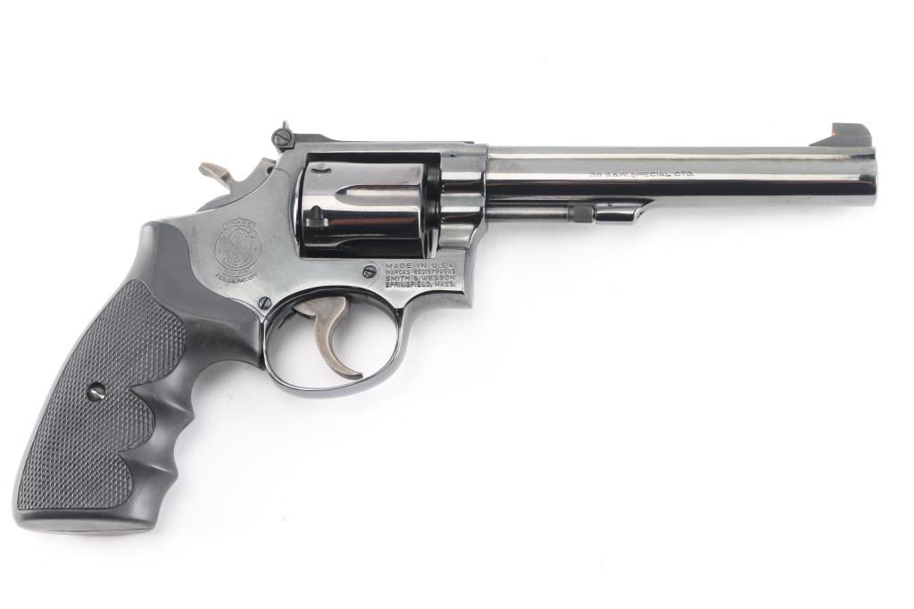 The K-38 Target Masterpiece Medium frame double action revolver chambered in .38 Special, manufactured circa 1967. Features a blued finish, pinned 6" barrel with serrated sighting rib, raised patridge front sight with orange rectangle, adjustable micrometer click rear sight with white square notch, fluted six-shot cylinder, non-shrouded ejector rod, case colored serrated .265" trigger, case colored .375" checkered spur target hammer, three screw square butt K target frame with ten groove back strap, Uncle Mikes black rubber checkered finger groove grips. Bore is bright with strong rifling. Retains approx. 98% finish with little to no losses or marks. Grips are excellent condition. Action is smooth with solid lock-up. Includes factory box, tool and cleaning rod. NRA Condition is excellent. ***C&R Firearm***