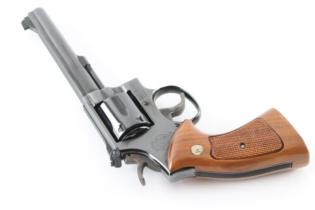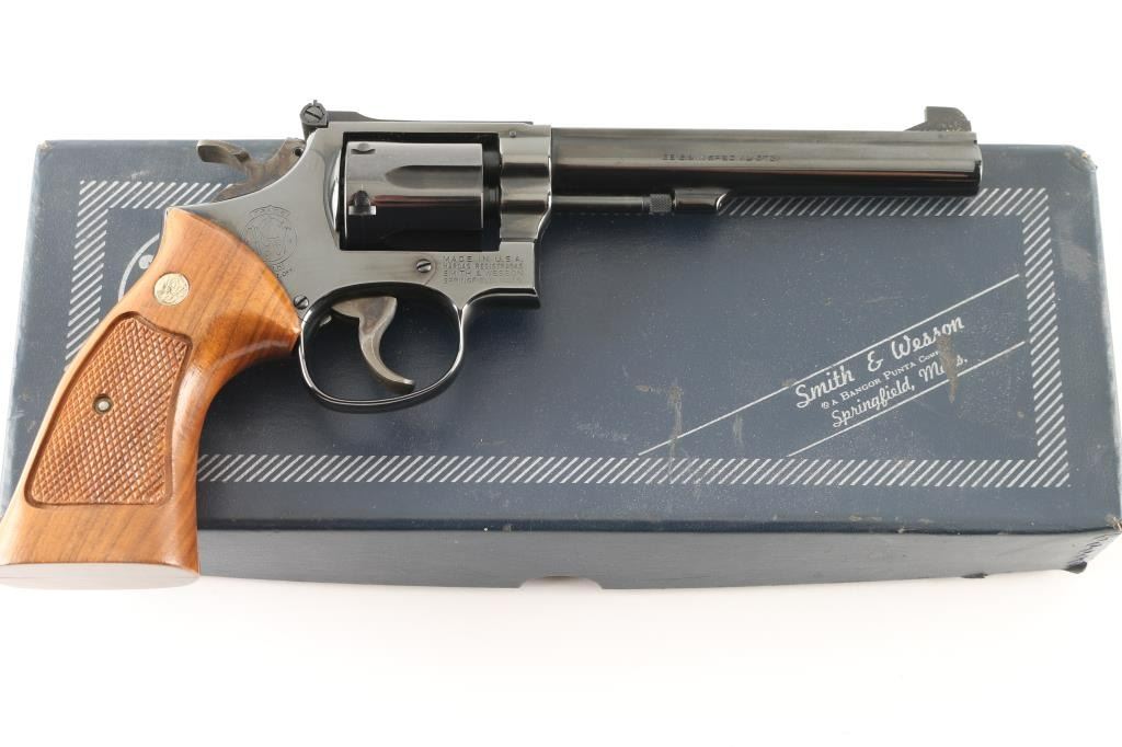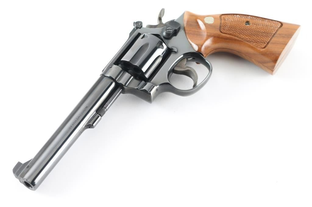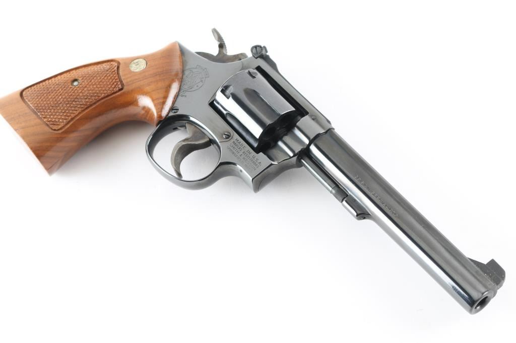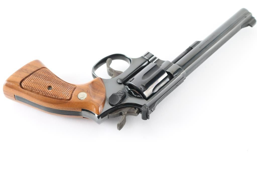 'The K-38 Target Masterpiece' Medium frame double action revolver chambered in .38 Special, manufactured circa 1977. Features a blued finish, pinned 6" barrel with serrated sighting rib, raised patridge front sight, adjustable micrometer click rear sight, fluted six-shot cylinder, non-shrouded ejector rod, serrated .500" trigger, .500" checkered spur target hammer, three screw square butt K target frame with ten groove back strap, and two-piece checkered walnut target grips with S&W medallions. Bore is excellent. Retains 98% finish with minor handling marks, thin cylinder drag line. Grips are excellent condition. Action is smooth with tight lock-up. Includes a factory two piece blue cardboard box with documents, parchment paper, factory cleaning kit. Condition is NRA Excellent *** Modern Firearm ***