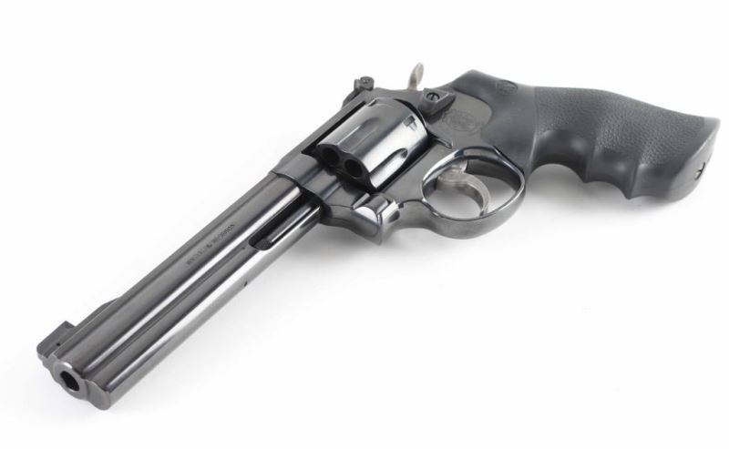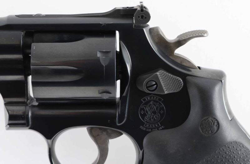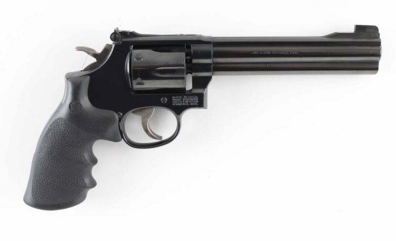 'The K-38 Target Masterpiece' Medium frame double action revolver chambered in 38 Special. Features a blued finish, 6" barrel with full length underlug & partially serrated wide sighting rib, raised patridge front sight, adjustable micrometer click rear sight, fluted six-shot swing-out cylinder, medium width smooth faced trigger, checkered wide spur semi-target hammer, three screw square butt K target frame with grooved back strap and black rubber finger groove mono grip. Revolver retains approximately 95% of it's original blued finish showing a drag line on the cylinder, scattered scratches. Action is smooth with good lock up, the bore is pristine and the grips are fine. Condition is NRA Excellent *** Modern Firearm ***