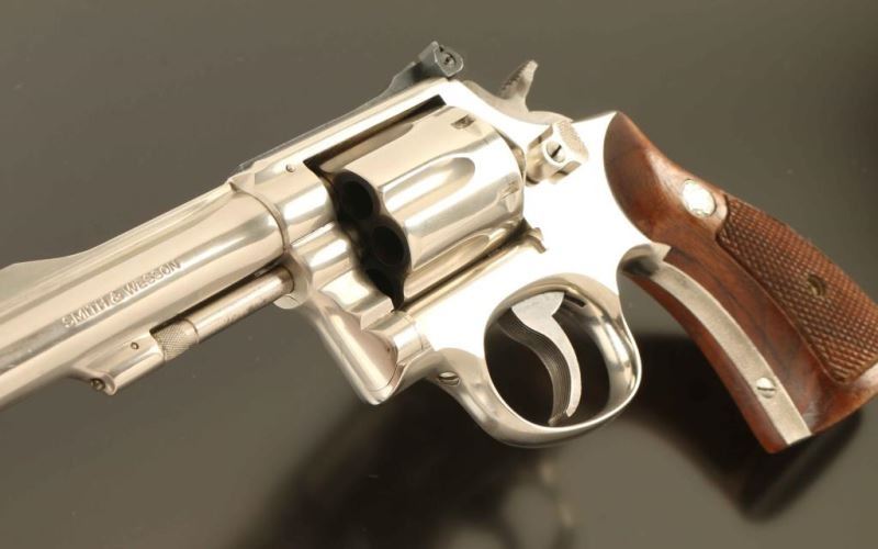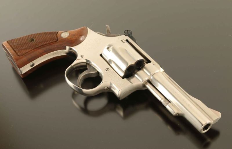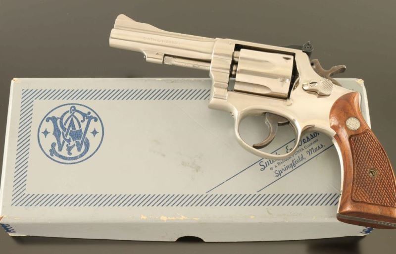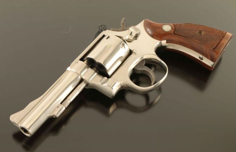 'The K-38 Combat Masterpiece' Medium frame double action revolver chambered in 38 Special, manufactured circa 1961. Features a nickel plated finish, pinned 4" barrel with serrated sighting rib, raised ramp front sight accented with red filler, adjustable micrometer click rear sight, non-shrouded ejector rod, alloy six-shot cylinder, serrated .265" trigger, .375" semi-target hammer, flat latched thumb piece, four screw square butt K alloy service frame and two-piece diamond checkered walnut Magna grips with silver S&W medallions. Includes the original factory gray two-piece cardboard box with matching label. The revolver retains nearly all of it's original nickel plated finish showing a cloudy appearance and light drag line on the cylinder. Action is smooth with tight lock up, bore is excellent and the wood grips are near fine with some finish loss. Condition is NRA Very Good+++. ***C&R Firearm****