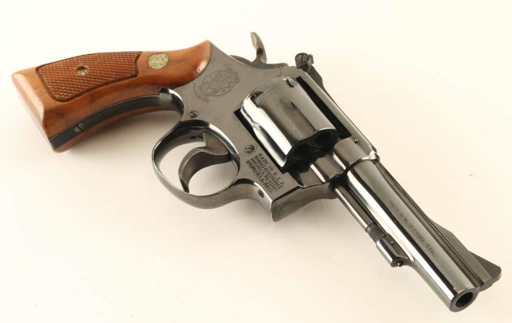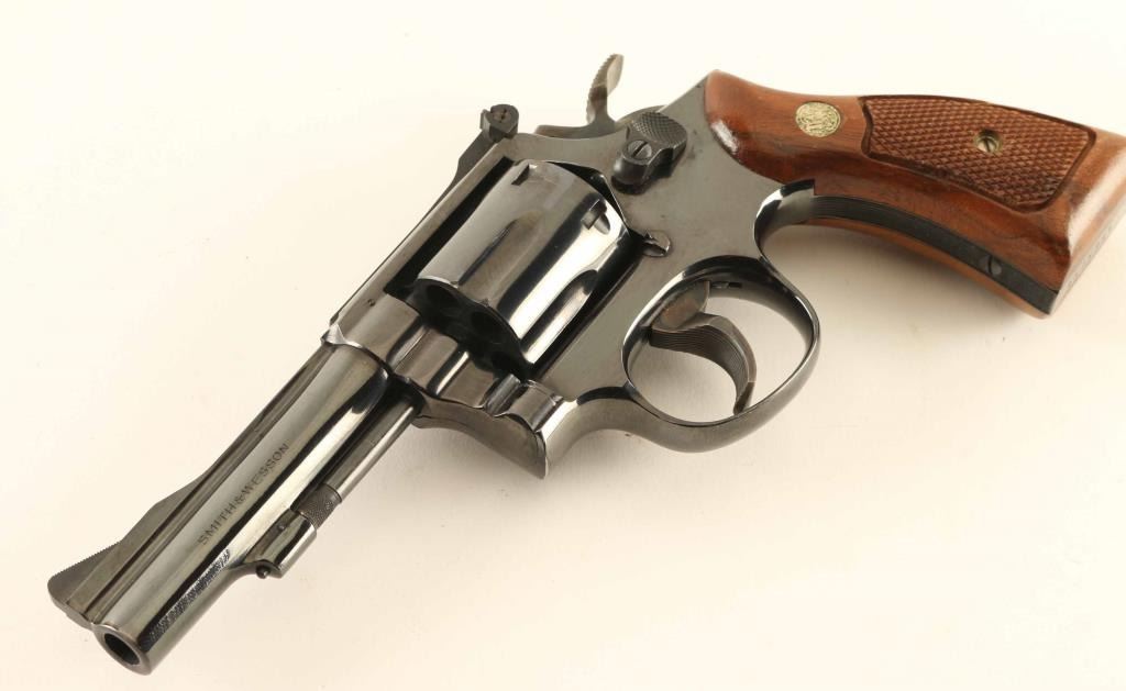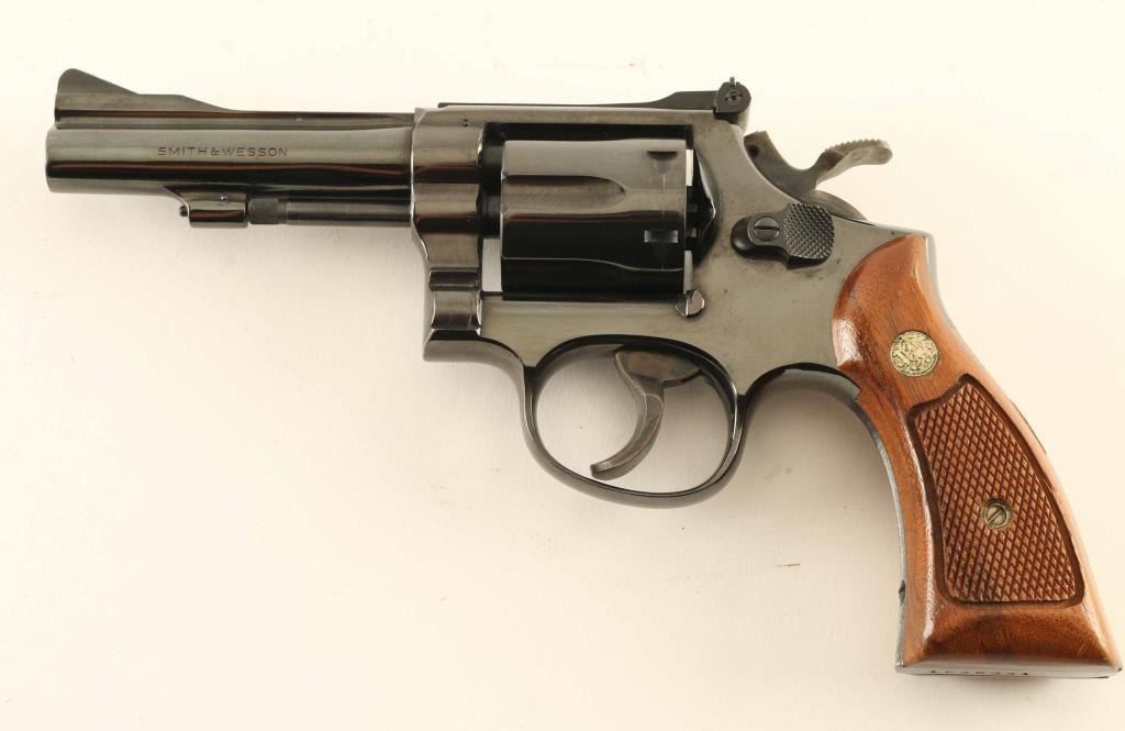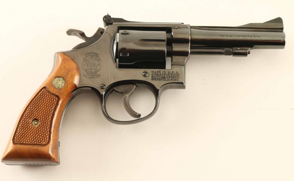 'The K-38 Combat Masterpiece' Medium frame double action revolver chambered in 38 Special, manufactured circa 1977-1982. Features a blued finish, pinned 4" barrel with serrated narrow rib, raised serrated ramp front sight, adjustable micrometer click rear sight, non-shrouded ejector rod, fluted six-shot cylinder, serrated .500" target trigger with adjustable stop, .500" target hammer, three screw square butt K target frame and two-piece checkered walnut Magna grips with silver S&W medallions. Revolver retains approximately 98% original finish showing minor edge wear and handling marks. Action is smooth with good lock up, the bore is excellent and the wood grips are very good. Condition is NRA Excellent. ***Modern Firearm****